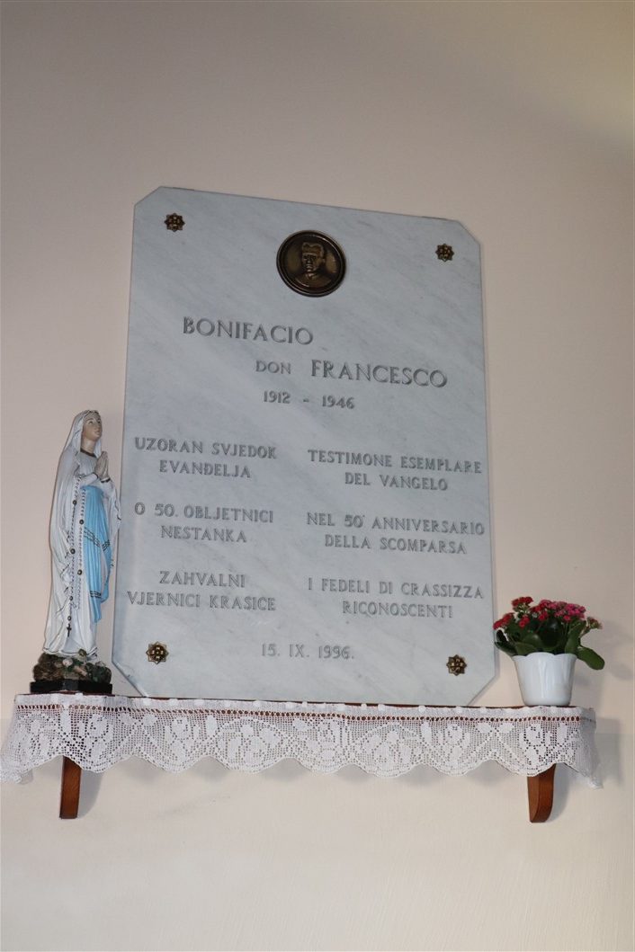 Ravalico se prisjetio i događaja 15. rujna 1996., velike proslave obilježavanje 50. obljetnice mučeništva, više stotina hodočasnika okupilo se na toj proslavi, iz Hrvatske, Italije i Slovenije. Tom je prigodom u crkvi postavljena dvojezična spomen ploča kao znak oprosta i nade. Spomenuo je i tadašnje naslove u medijima, jedan od najučestalijih komentara onih koji su ga poznavali bio je „kao da don Francesco nije nikada otišao“, toliko se jako osjećalo živo zajedništvo kojemu ih je on učio. Vjera žitelja ovoga područja prenosi se s generacije na generaciju, a dio je tog naslijeđa i živo sjećanje na don Francesca, zaključio je Ravalico.