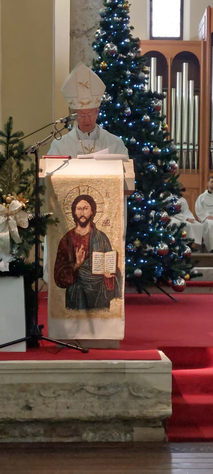Na početku homilije, biskup je posvijestio, kako je „rođenje Isusovo povijesni događaj, koji se zbio u vrijeme rimskog cara Augusta, u maloj pokrajini carstva, Palestini. Rođenje, reći ćemo, kao svako ljudsko jednostavno, čak i prejednostavno, siromašno, izbjegličko. Ipak, rođenje Kristovo je jedinstveno i čudesno: za nas kršćane je to Božje otajstvo, misterij što ga jedva možemo naslutiti, tek malo razumjeti. Onaj naime, veliki i sveti, koji je svim ljudima uvijek progovarao po glasu savjesti i po veličini mudrosti – dobro(s)ti prirode, ali koji je uvijek ostao tajanstven, nevidljiv, pa i nerazumljiv. a koji je u Božjem narodu Izraelu tijekom 2000 godina po Abrahamu, Mojsiju i prorocima obećavao svoj dolazak i spasenje – On je u liku Djeteta iz Betlehema postao čovjekom, kako kažemo u Vjerovanju, radi nas ljudi i radi našega spasenja” Veliki, sveti, nevidljivi i tajanstveni postao je čovjekom da nam se pokaže kakav On uistinu jest: on je sama dobrota“.
