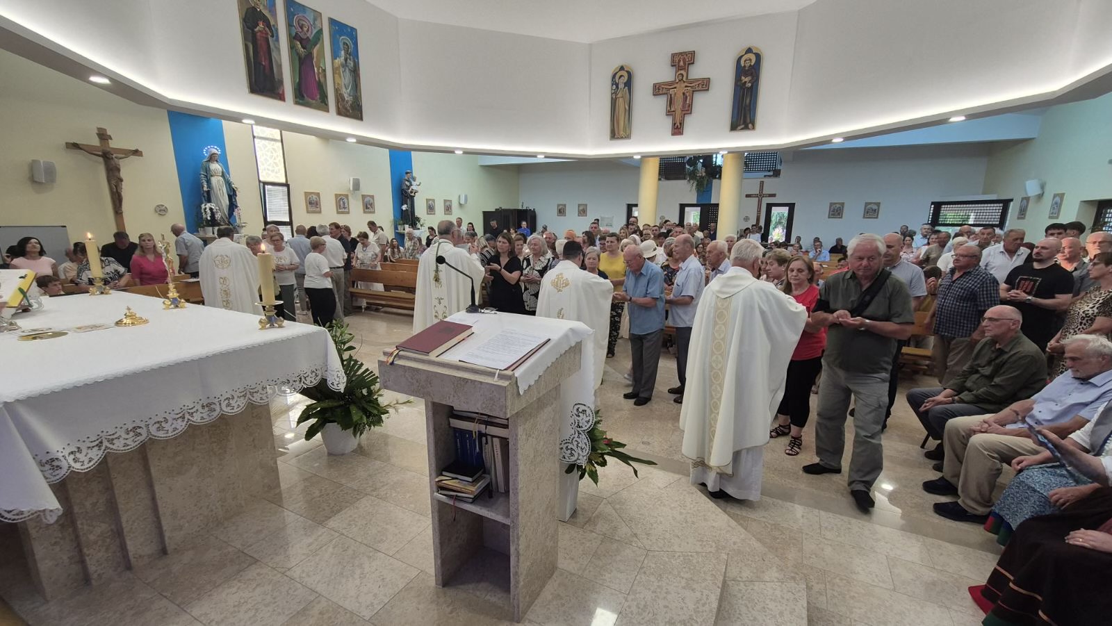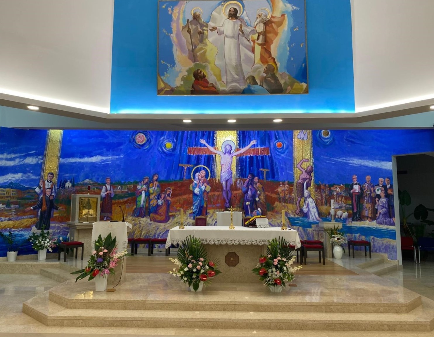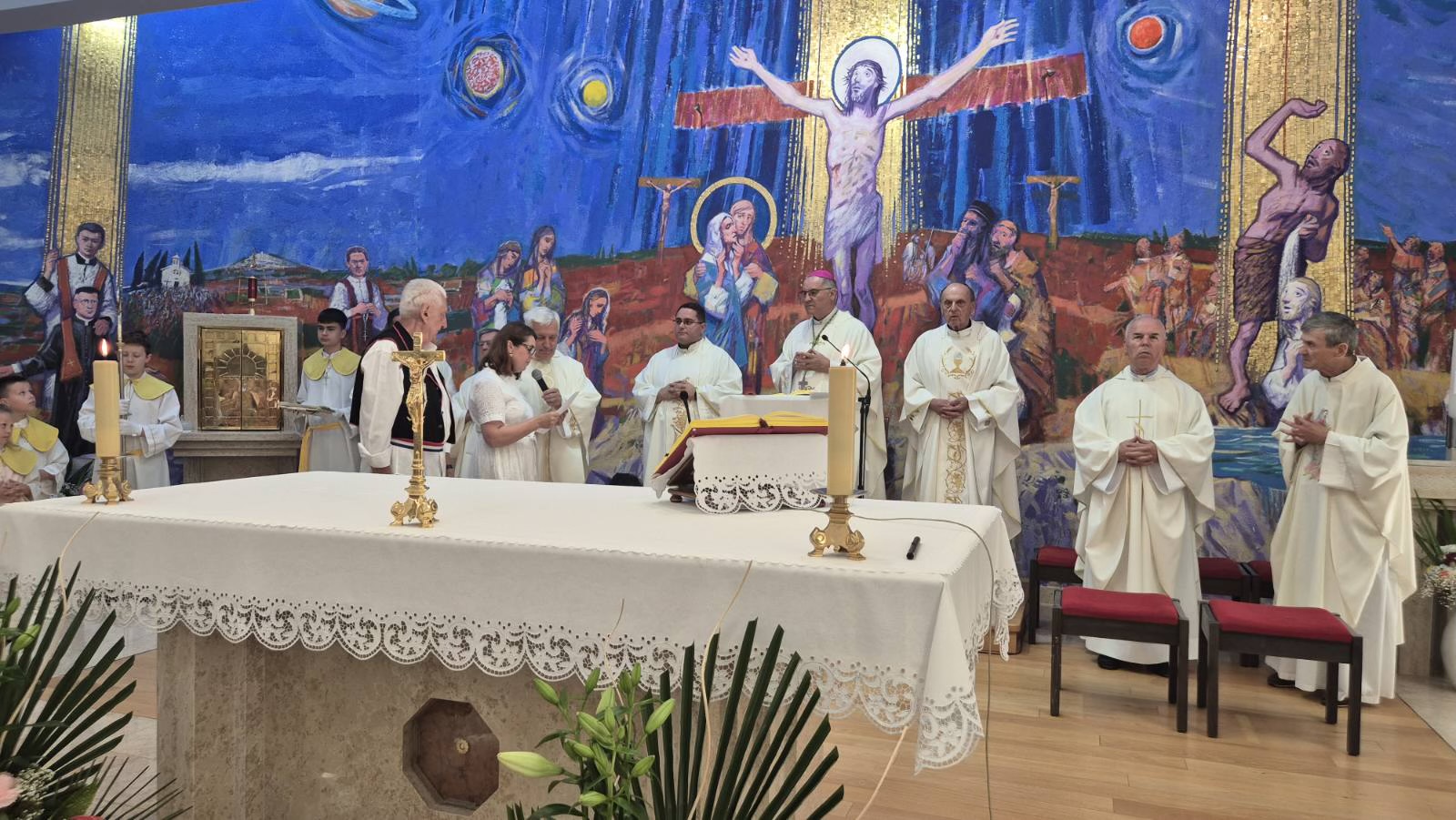 Na kraju svete Mise, a prije nego što je biskup Štironja blagoslovio oltarnu sliku, župnik fra Đuro Hontić zahvalio je gospođi Karin Peruško čijom je darežljivošću izrađena ova slika. Potom je pozvao prof. Stanka Špoljarića, likovnoga kritičara i autora akademskog umjetnika gosp. Tihomira Lončara da predstave sadržaj i poruku nove oltarne slike koja pokriva zid iza oltara površine 70 kvadratnih metara, i u kojoj je oko sedam metara zlatnog venecijanskog mozaika.