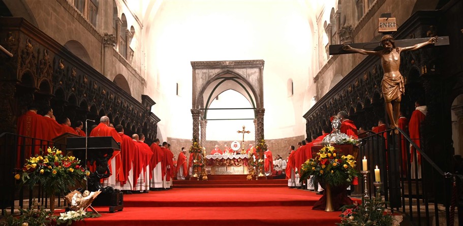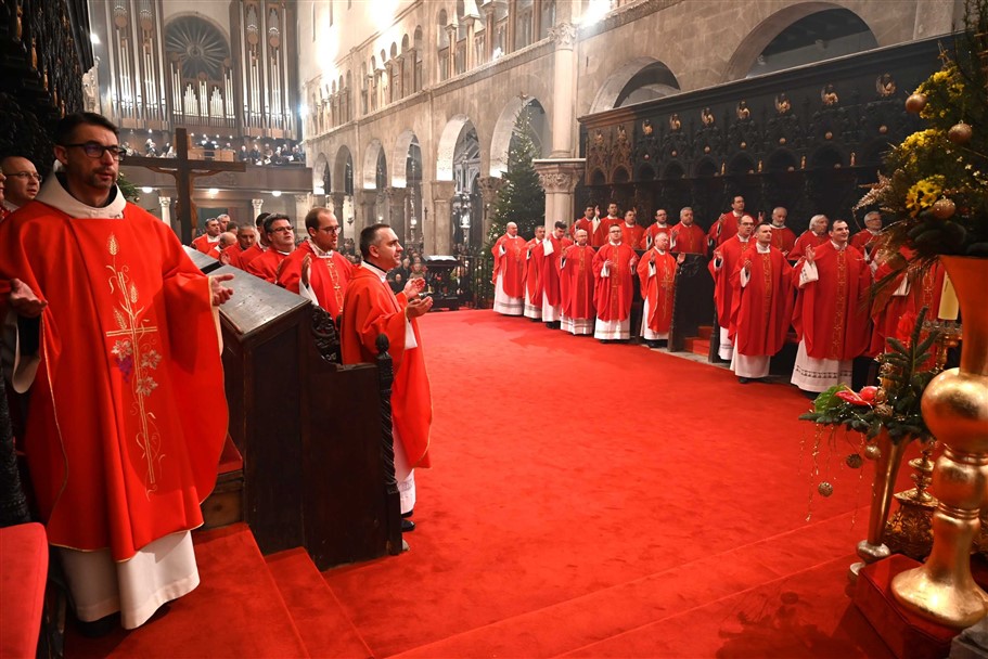 Pjevanje na misi predvodio je Katedralni zbor sv. Stošije pod ravnanjem mo Žana Morovića i u orguljaškoj pratnji Dragana Pejića. Na početku mise koja je počela ulaznom procesijom od sakristije katedrale preko Trga Sv. Stošije, biskupi su se pomolili pred moćima sv. Stošije u pokrajnjoj lađi katedrale gdje se od 810. godine nalaze moći sv. Stošije koje je zadarski biskup Donat dobio od bizantskog cara Nicefora u zahvalnosti za posredovanje mira između Istočnog bizantskog i Zapadnog rimskog carstva.