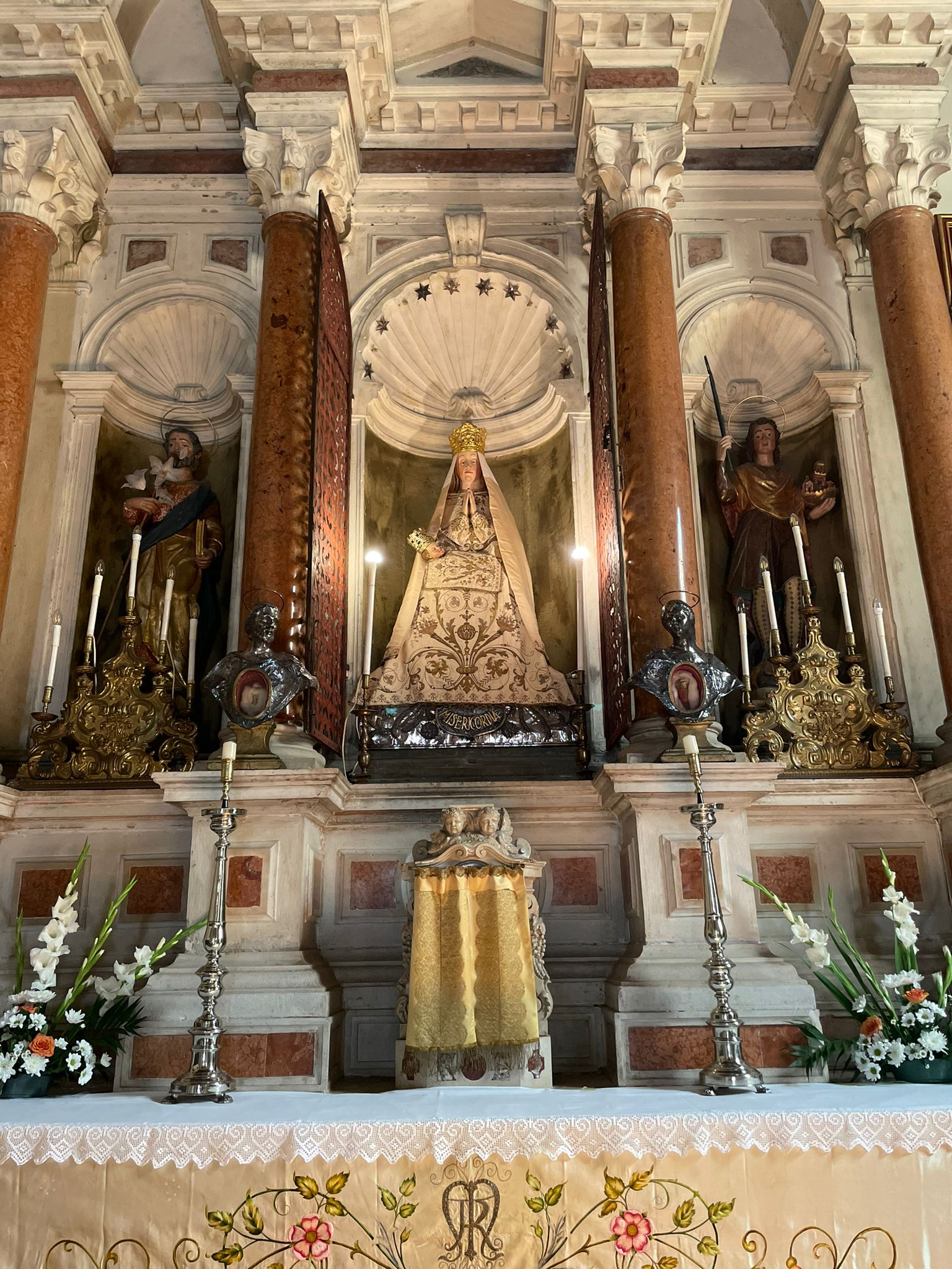 Crkva Majke Božje Milosrđa sagrađena je 21.06.1497. kao zavjetni dar Pavla Račice. On je usnuo san u kojem je vidio Gospin lik, te se nakon toga uputio u Veneciju. Kod majstora Paola Campsa pronašao je upravo takav kip koji je vidio u snu, skulpturu gotičkog stila, Gospa sa sklopljenim rukama u krilu (na koljenima) joj dijete Isus. Vrativši se iz Venecije odmorio se na svom imanju podno zidina, položivši kip na kamenu klupu. Nakon toga niti uz pomoć drugih mještana nije bilo moguće pomaknuti kip. To je bio znak da na svom imanju sagradi kapelicu Majci Božjoj, a kasnije je na tom mjestu izgrađena crkva koja je tokom stoljeća u više navrata proširena. Za smještaj kipa dao je izgraditi zlatnu palu kod majstora Campsa.
