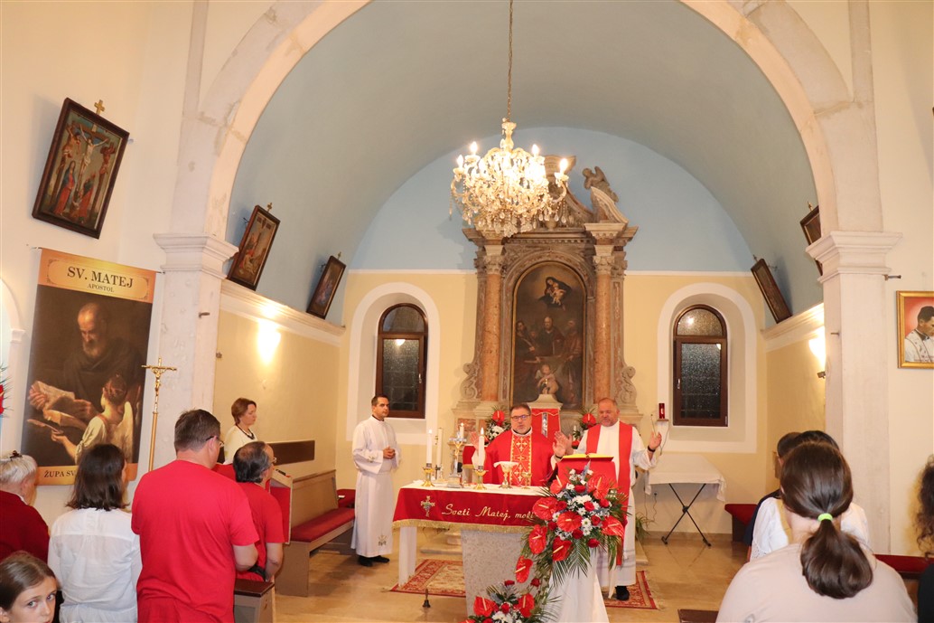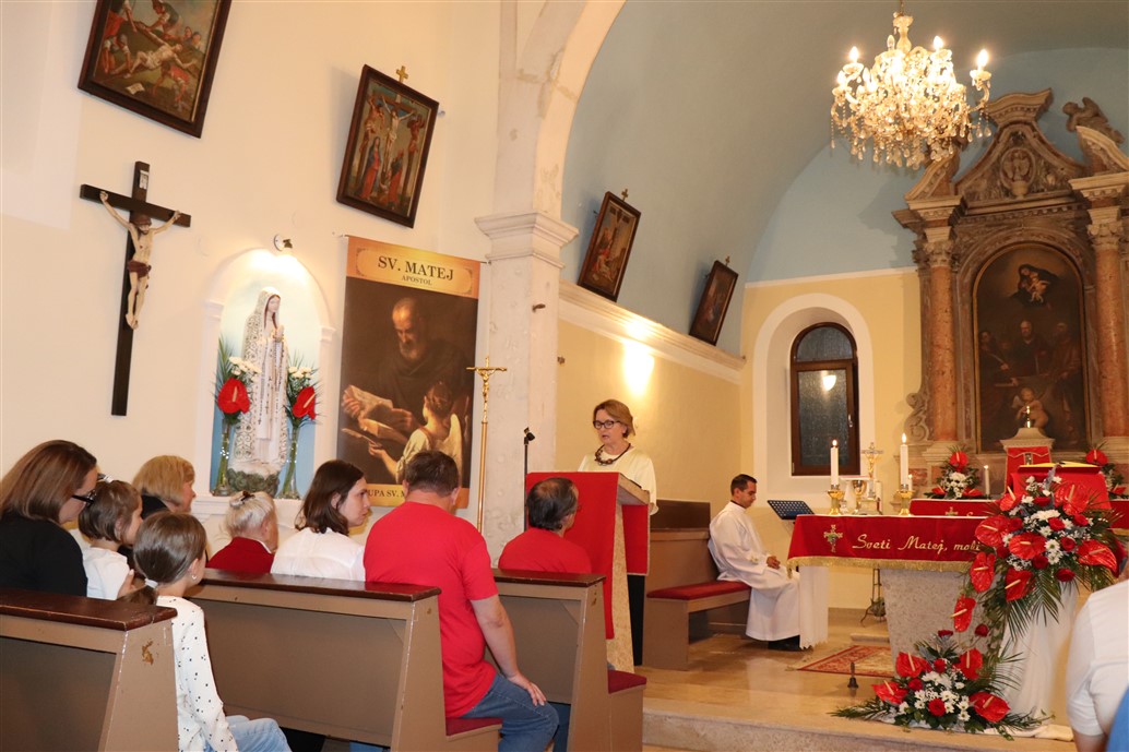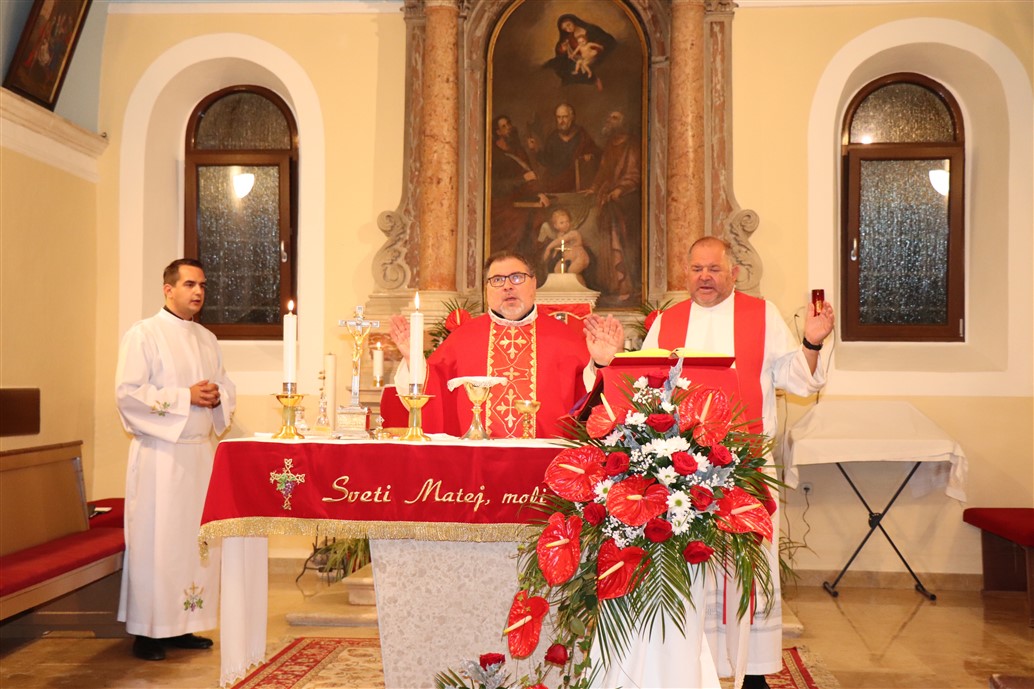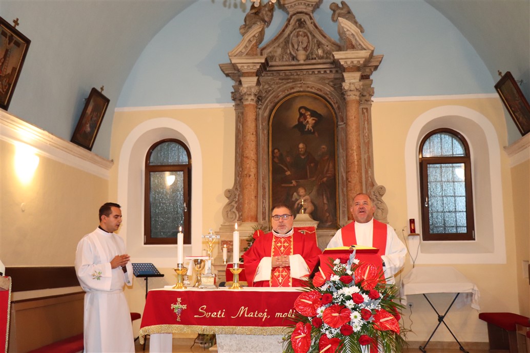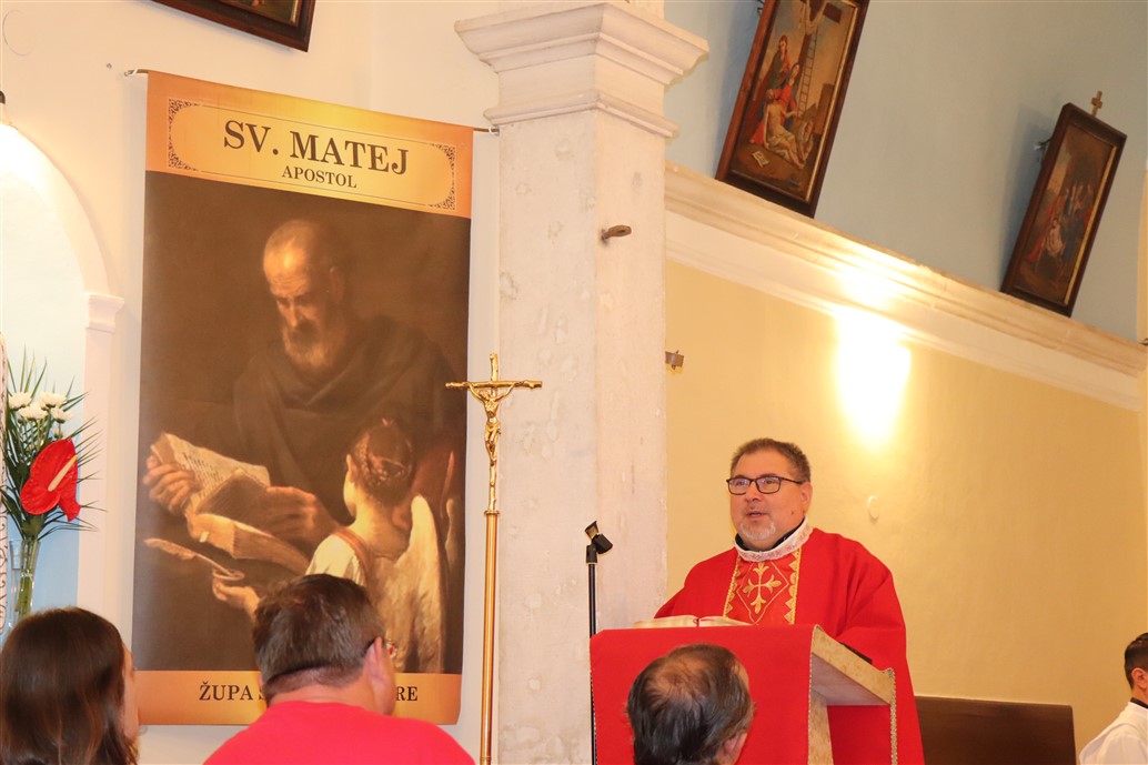 Nakon uvodnih pozdrava domaćeg župnika vlč. dr. sc. Bernarda Jurjevića misu je predvodio vlč. Geremia Massa, župnik u Hreljićima I Filipani. Vlč. Massa je u prigodnoj homiliji posvijestio okupljenima da nije dobro ograničiti se samo na slavljenje svetkovina kao vjerskih tradicija, već nam to treba biti poticaj da se zapitamo što je poziv svakoga od nas – a to je da budemo slika Isusa Krista u svijetu, u okolnostima u kojima živimo i djelujemo. Razlamajući Riječ Evanđelja propovjednik je istaknuo dio koji donosi zapis da je Isus ‘ugledao’ Mateja, gdje je to ‘gledati’ daleko dublje od pogleda vidom, riječ je o pogledu s ljubavlju, „i dok smo za mnoge ljude mi nevidljivi, Gospodin nas primjećuje i kada nas drugi ne žele vidjeti“. Pozvao je okupljene da to euharistijsko slavlje bude zaista susret s Gospodinom.