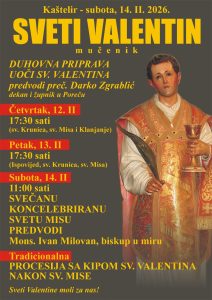 U subotu 14. veljače župa Kaštelir slavi svog suzaštitnika sv. Valentina mučenika. Dvodnevnu pripravu uoči velikoga slavlja predvodi preč. Darko Zgrablić, župnik u Poreču. A središnje slavlje u subotu u 11 sati predslavi mons. Ivan Milovan biskup u miru.