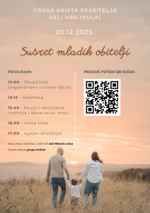 U subotu 20. prosinca, u crkvi Krista Kralja u Puli (Veli Vrh) susret je mladih obitelji. Susret započinje u 15 sati. Tijekom susreta organizirano je čuvanje djece.