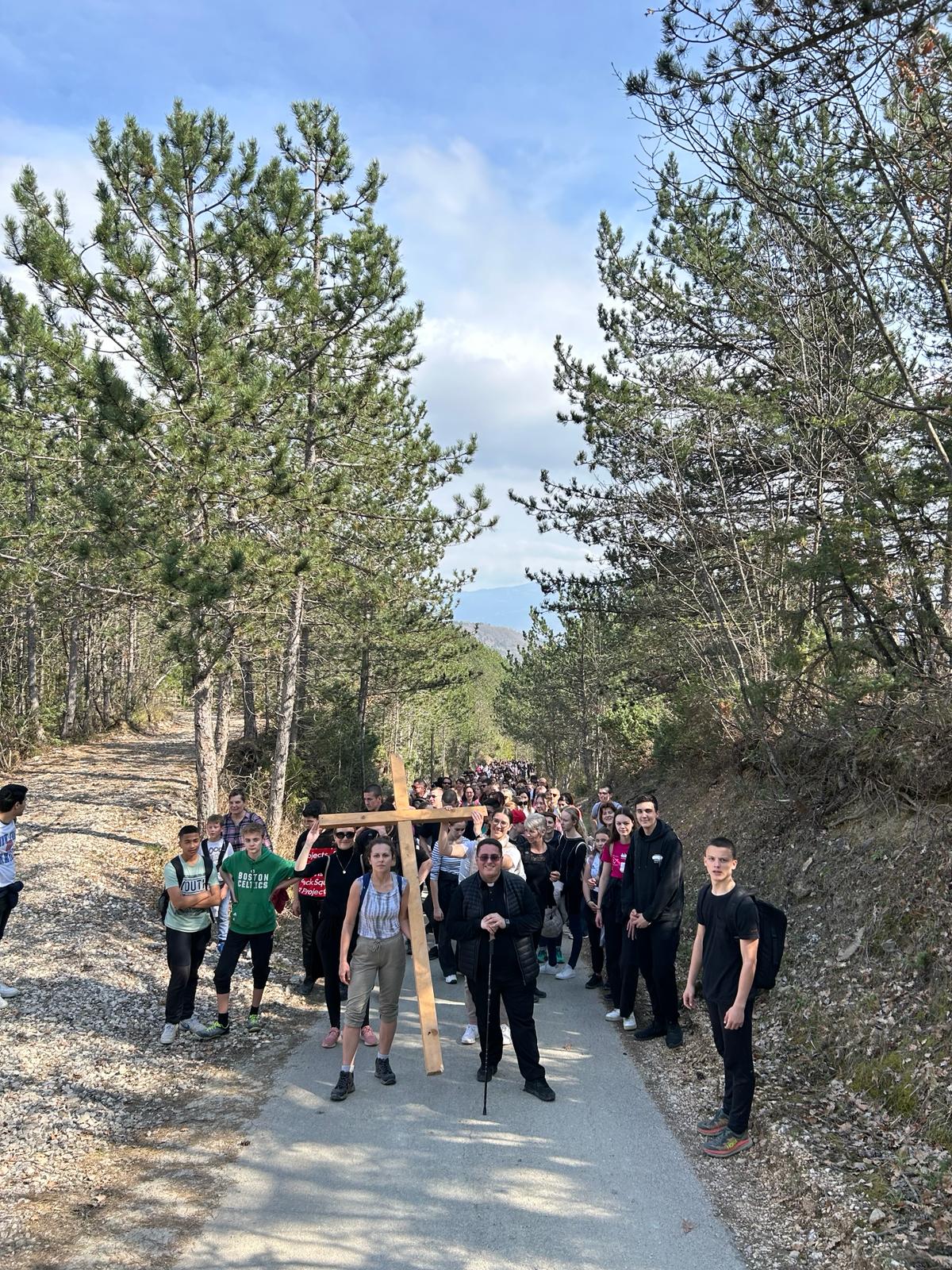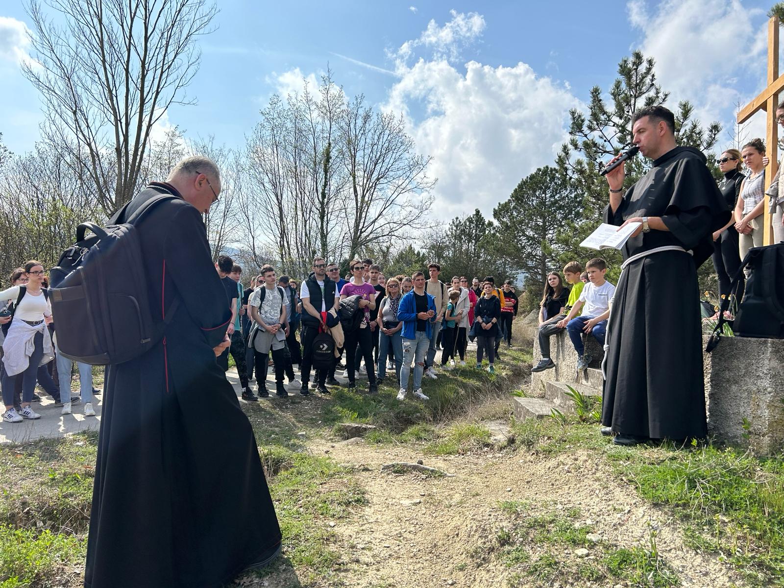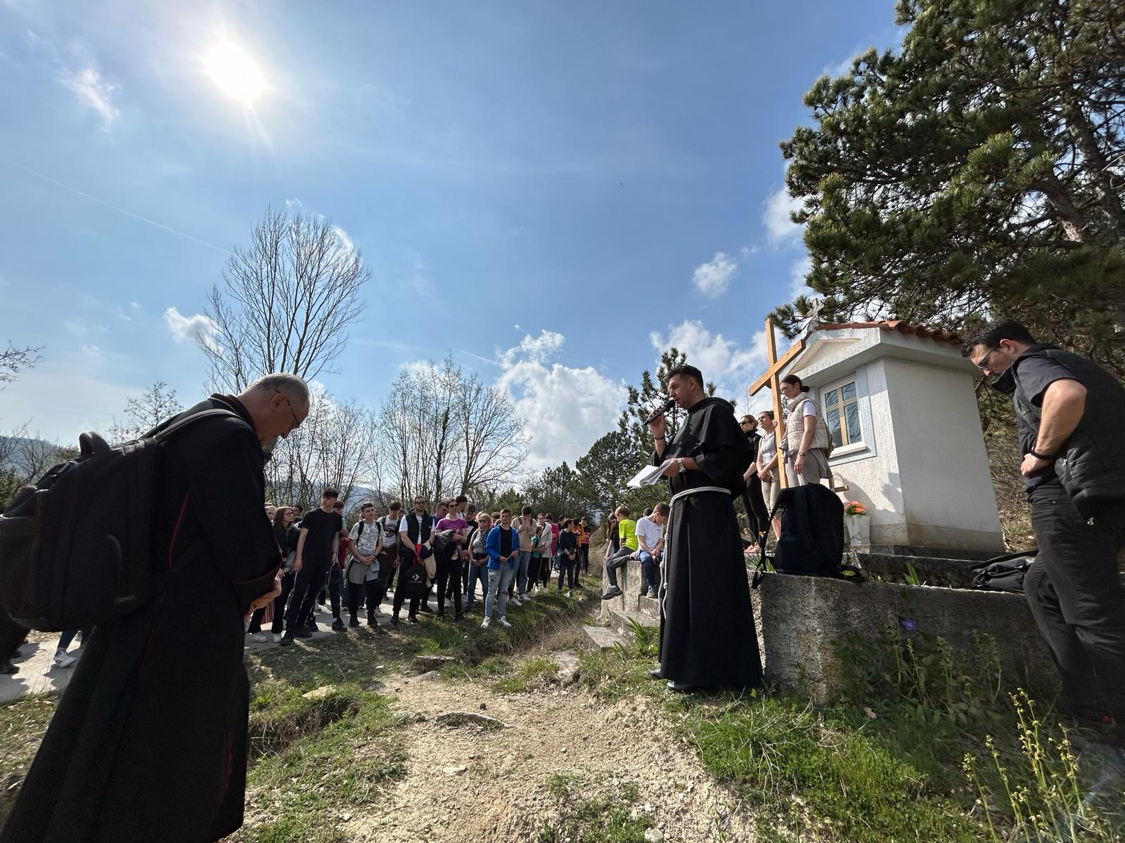 Okupljeni su se potom uputili prema prvoj postaji na Stazi sv. Šimuna. Uslijedila je uvodna molitva pobožnosti križnog puta koju je spontano vodio fra Stjepan. Uz svaku postaju izrekao je kraće razmatranje kojim je ohrabrio i potaknuo mlade da svojim životom slijede Isusa.