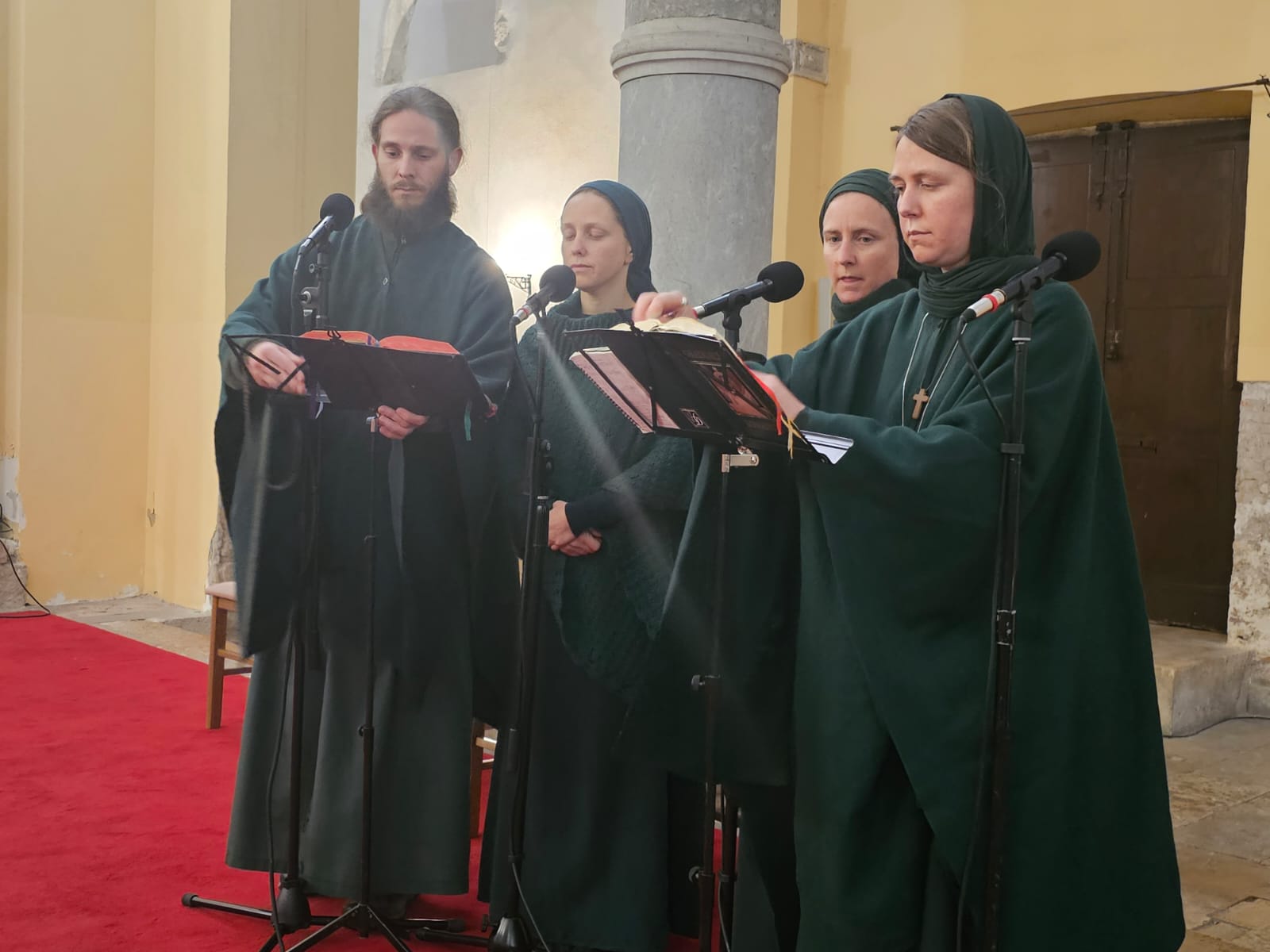 Vokalisti su pjesmom pratili misno slavlje a potom su nastupili s duhovnim skladbama iz raznih dijelova svijeta, ali i skladbama različitih konfesija koje se izmjenjuju u slavljenju liturgije na Kristovu grobu. Na programu je prvo bio Uskrsni himan. Uslijedila je pjesma iz židovske tradicije Deroshna, uskrsni tropar istočne crkve koji uvodi u Baziliku Svetog groba – mjesto gdje je naš Gospodin razapet i uskrsnuo – gdje se okuplja 6 različitih kršćanskih vjeroispovijesti, od kojih svaka slavi svoju liturgiju. Uslijedila je pjesma iz sirijske tradicije, otpjevali su „Oče naš“ na aramejskom. Slijedeća je bila marijanska pjesma iz grčke tradicije, “Agni Parthene”, koja litanijski kliče: “Raduj se, zaručnice djevičanska”. Uslijedila je pjesma Surp iz armenske tradicije. Naredna je bila skladba iz koptske tradicije „Epo zlato“ koja zaziva “Kralju mira, daj nam svoj mir”, za sve kršćane na Bliskom istoku, koji su teško progonjeni od islamista.