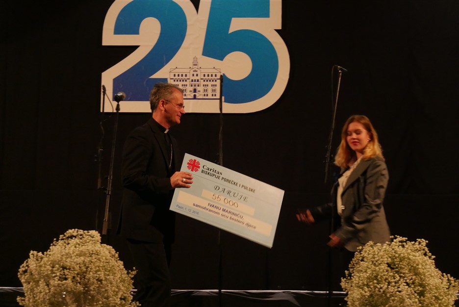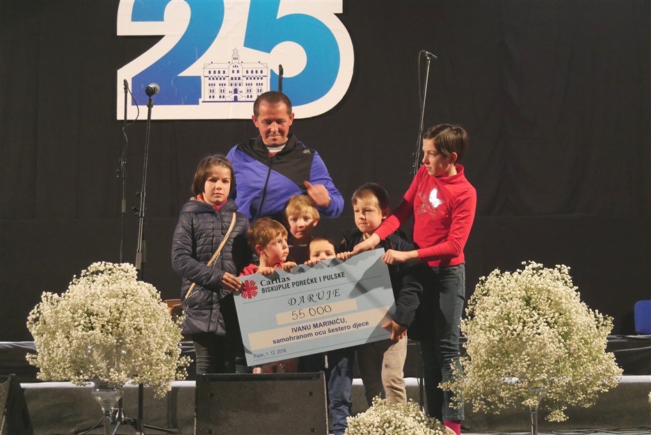 Biskup je potom Ivanu Mariniću, samohranom ocu šestero malodobne djece kojima je majka iznenada preminula, uručio ček na iznos od pedeset i pet tisuća kuna, od kojih je dio sakupljen od ulaznica za koncert, a ostalo je nadodao biskupijski Caritas. Ivan Marinić je ček primio došavši na pozornicu zajedno sa svih šestero mališana, a voditeljica programa, Melita Gržić Pincin je napomenula kako mu je toga dana ujedno i rođendan, što je publika popratila još jednim čestitarskim pljeskom. Obitelji Marinić, koja sada živi u podstanarstvu u Žminju, će biskupijski Caritas, uz pomoć drugih subjekata, pomoći izgraditi vlastiti dom na zemljištu u selu Bričanci, nedaleko Svetvinčenta, koje im je prethodno donirano i gdje već održavaju manje stočarsko obiteljsko gospodarstvo.
