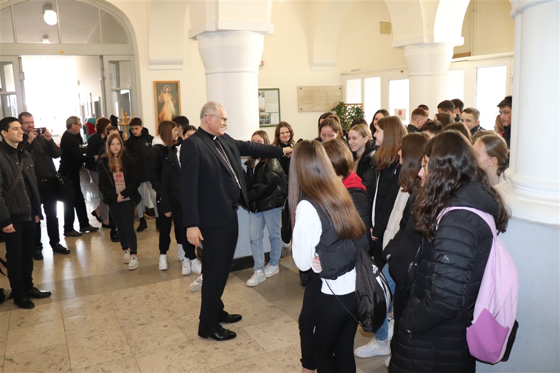 Potom su otišli u Pazinski kolegij, gdje je bl. Bulešić, kad je podnio mučeništvo, obnašao službu podravnatelja. Ondje ih je primio pomoćnik ravnatelja vlč. Filip Celent, koji im je progovorio o slavnoj povijesti zgrade Pazinskog kolegija koja je izgrađena 1914. godine kao đački konvikt, te o povijesti Pazinskog Kolegija – klasične gimnazije koji ove godine obilježava 30. obljetnicu osnutka. Hodočasnici su, u pratnji vlč. Celenta obišli dio zgrade, a potom ih je u atriju pozdravio porečki i pulski biskup mons. Ivan Štironja koji je toga dana ondje sudjelovao na korizmenom susretu članova župnih Caritasa Porečke i Pulske biskupije. Mons. Štironja se je s krizmanicima zadržao u srdačnom razgovoru.