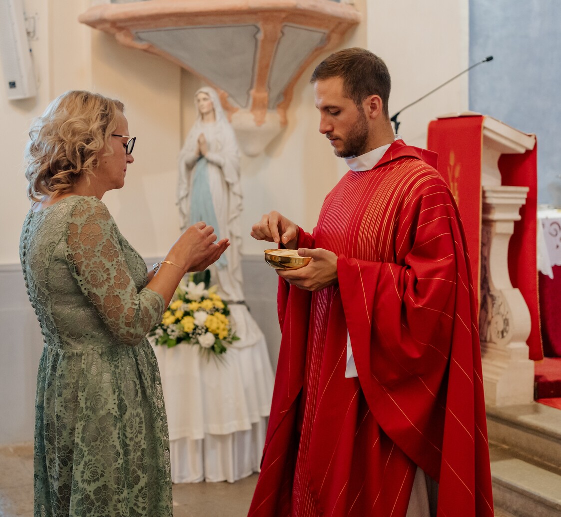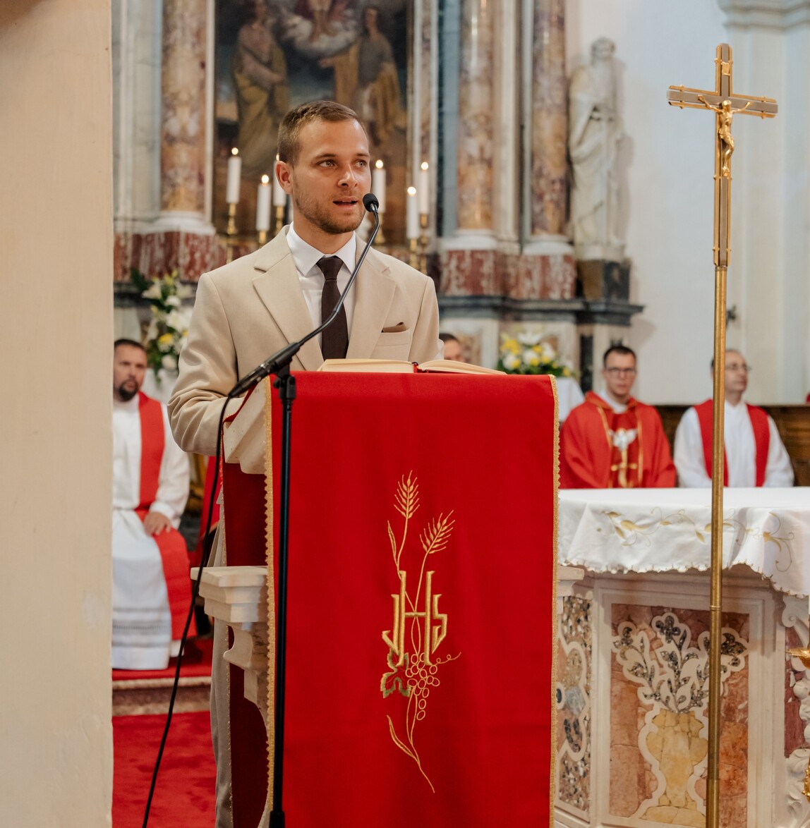 ‘O kako volim, Gospodine, biti na pragu tvojega doma’, kazuje psalmist, uronjen u duboku čežnju za Božjom blizinom. Mladomisnik naše župe, Dino Deltin, rođen 14. lipnja 1994. od oca Marčela i majke Gracijele, kroz godine odrastanja uz Neokatekumenski put, osjetio je da ga Bog nježno poziva i zaokuplja, te je 14. lipnja, na svoj rođendan, sa svetim povjerenjem postao Božji pastir pod geslom „Da, evo me!“