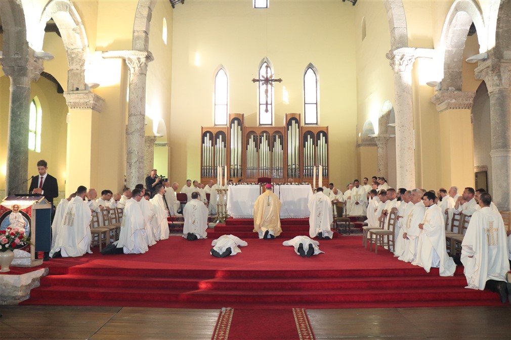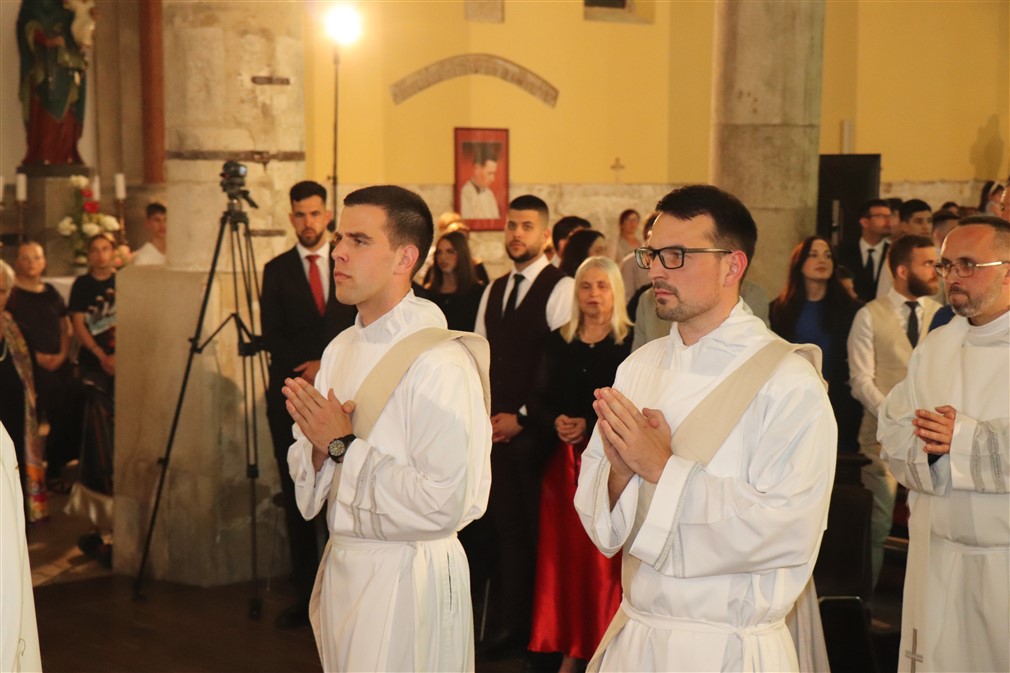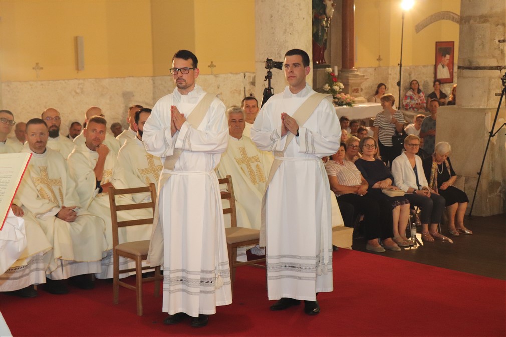 Biskup je pozvao sve nazočne na molitvu za đakone, svećenike i redovnike, za svećeničke i redovničke kandidate, kao i za nova duhovna zvanja. Zahvalio je roditeljima đakona na njihovu velikodušnu daru te đakone podsjetio da ih je još dok bijahu djeca Bog vezao „konopcima ljubavi“, kako to kaže prorok Hošea, te nastavio: „Bog je dakle onaj koji izabire, ne zato što je netko posebno pametan, zgodan ili prikladan nego zato što nas ljubi. Bog vas ljubi i šalje vas da tu njegovu ljubav, nježnost i milosrđe očitujete svemu narodu Božjemu osobito grešnicima, izgubljenim sinovima i kćerima. Krštenjem ste pribrojeni Božjem ljubljenom narodu i kraljevskom svećeništvu. Veliki svećenik Isus, koji je i sam pozvan od Oca, pozvao je svoje apostole i postavio ih da razglase kraljevstvo Božje. Obećavši da će sa svojima ostati do svršetka svijeta, Isus i danas upravlja apostolskim zborom. On, Glava Crkve, i danas se brine za svoj apostolski zbor, kao i za suradnike apostola pridružujući im prezbitere da svi skupa, vrše njegovo djelo, naviještaju Evanđelje po svem svijetu. Danas ćete i vi, dragi Vide i Tobija, biti promaknuti u red prezbitera, kako bi u Kristovo ime, kao suradnici biskupskoga reda, javno vršili službu učitelja, svećenika i pastira te tako služili Božjem narodu“.