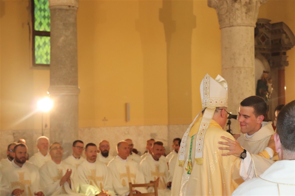 Biskup je prije otpusnog blagoslova čestitao mladomisnicima, istaknuvši, „molili smo danas za vas, da vas Duh Sveti po ravnom putu vodi“. Naglasio je, „ako budete istinski prihvaćali volju Božju, svi oni križevi koji će možda doći, bit će vam u životu blagoslov“. „Zato hrabro, ne bojte se, Isus je s vama. Njega uvijek na prvo mjesto, pa taman bili i 0, bit ćete čista desetka!“, rekao je simbolično biskup citiravši veliku Božju ugodnicu sv. Malu Tereziju, što je izazvalo gromoglasan pljesak svih okupljenih na toj misi ređenja. Biskup je izrekao čestitke i roditeljima i obiteljima ređenika te im zahvalio „za ova dična dva sina koja ste darovali Crkvi Božjoj, da mogu ići, kako Isus kaže, ‘po svem svijetu, propovijedati evanđelje, krstiti „u ime Oca i Sina i Duha Svetoga“’. Čestitke je uputio o neokatekumenskoj zajednici.