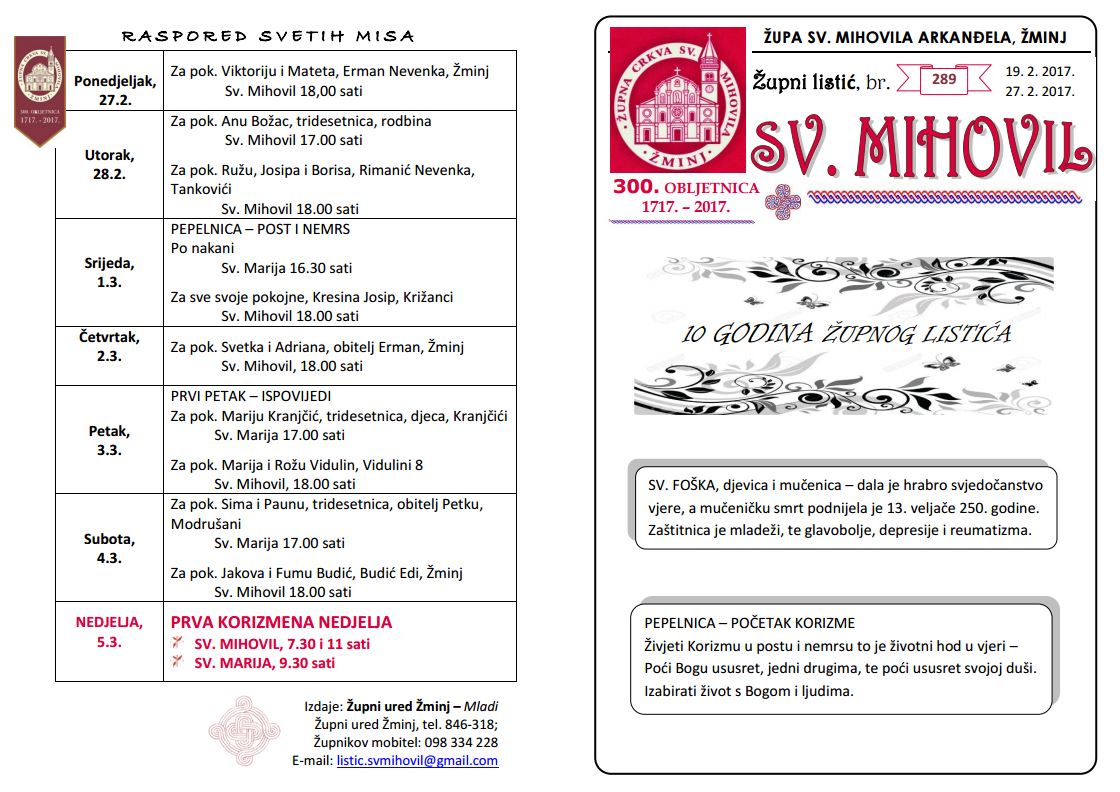 Na kraju misnog slavlja župnik je istaknuo kako se ove godine napunilo 10 godina od početka izlaženja Župnog listića žminjske župe „Sv. Mihovil“. Zahvalio je svima koji su, kroz tih deset godina doprinijeli njegovoj realizaciji. Sadašnji uređivači listića su: Marta Božac, Diana Erman, Jasmina i Lucija Jelenić, Melisa Udovičić i Roberta Unukić.