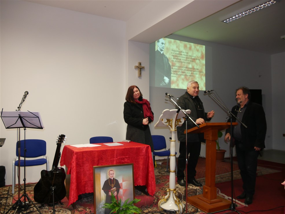 Uvodni pozdrav i riječ dobrodošlice publici je uputio župnik domaćin o. Đuro Hontić koji je između ostalog naglasio kako je blaženi kardinal slika „šuteće i trpeće Crkve“.