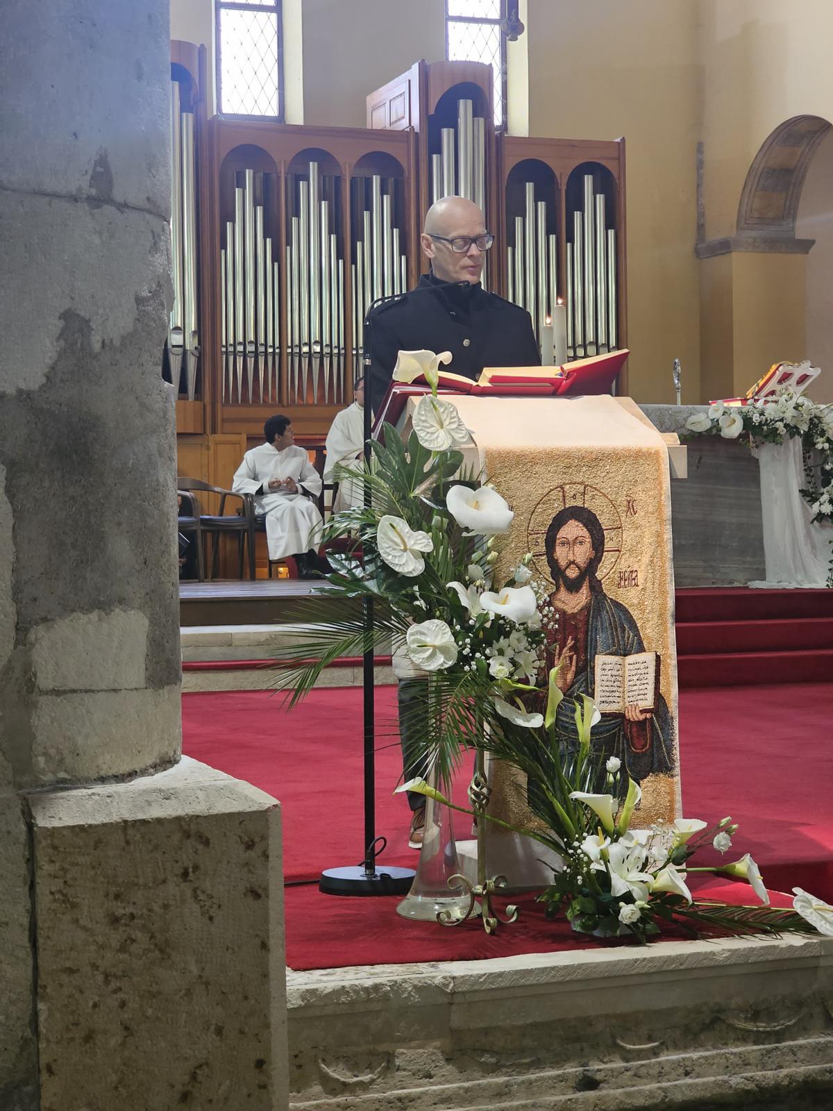 Umirovljeni porečki i pulski biskup mons. Ivan Milovan predvodio je misno slavlje na svetkovinu Uskrsnuća Gospodina našega, u nedjelju 20. travnja, u pulskoj katedrali. Suslavili su katedralni župnik Rikardo Lekaj, a posluživao je đakon Francesco Falsetti.