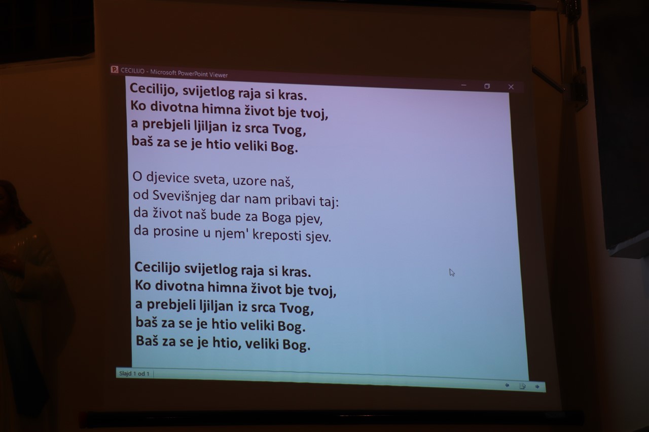 Govoreći o početku došašća propovjednik je istaknuo da „dok iščekujemo Kristov dolazak i mi trebamo njemu ići u susret.“ Obraćajući se pjevačima istaknuo je da treba imati na umu što je krajnji cilj svakog našeg angažmana, pa tako i pjevanja u Crkvi, „sve što činimo trebamo činiti da bismo došli u Kraljevstvo Nebesko“. „Pjevanje nam diže duh“, naglasio je propovjednik. Istaknuvši da je Bog Trojstvo naglasio je važnost zajedništva i među ljudima. Homiliju je nastavio naglasivši važnost poniznosti koja je nužna u zajednici, citatom „tko želi biti prvi neka bude svima poslužitelj“ istaknuo je da to vrijedi i za pjevače koji svojim pjevačkim sposobnostima služe prvo Bogu a onda i zajednici koja kroz i to pjevanje doživljava Božju dobrotu. „Ljepota pjevačeva glasa ne smije služiti da bi se osoba izdigla iznad ostalih, već da pomaže svima da dožive ljepotu Kraljevstva Nebeskoga prema kojemu nas vodi Isus Krist.“
