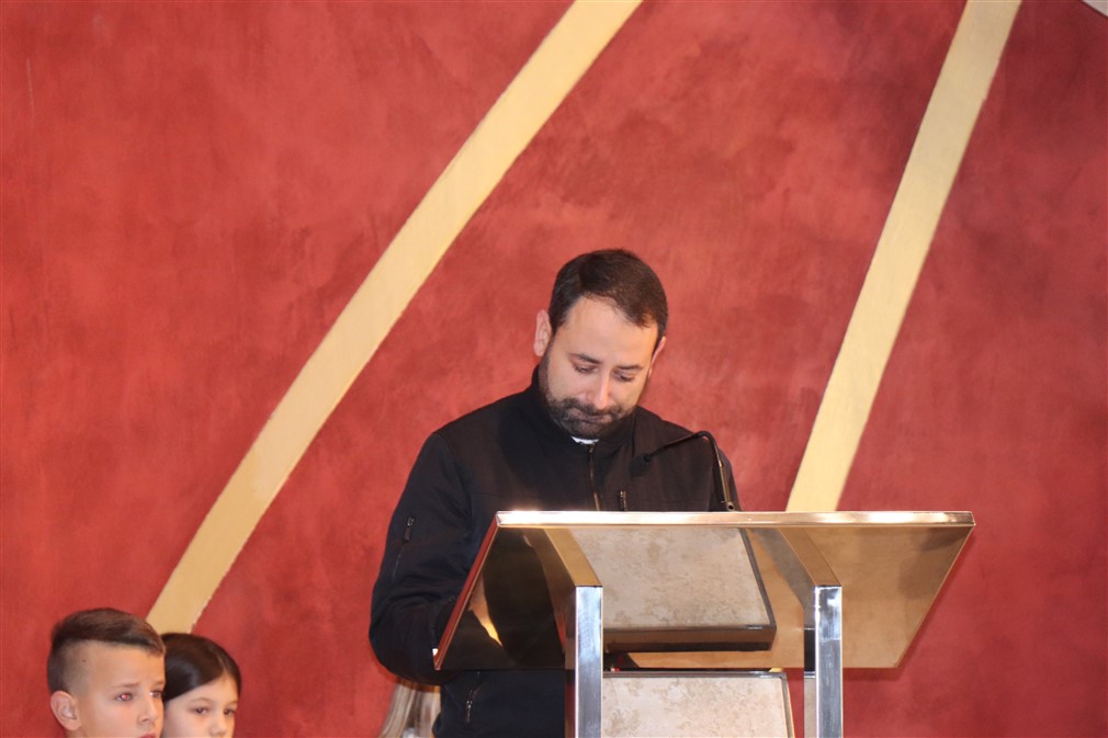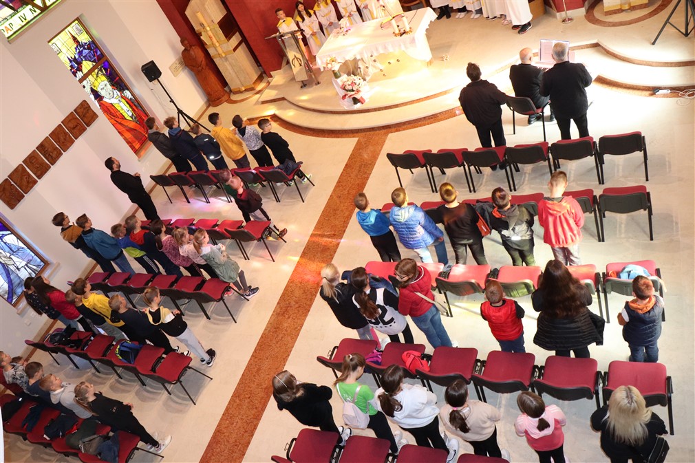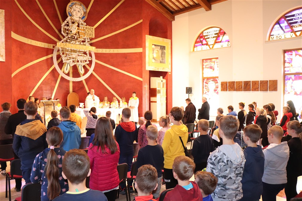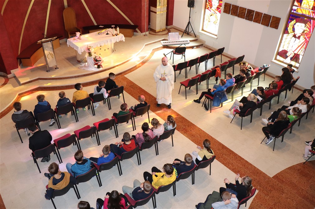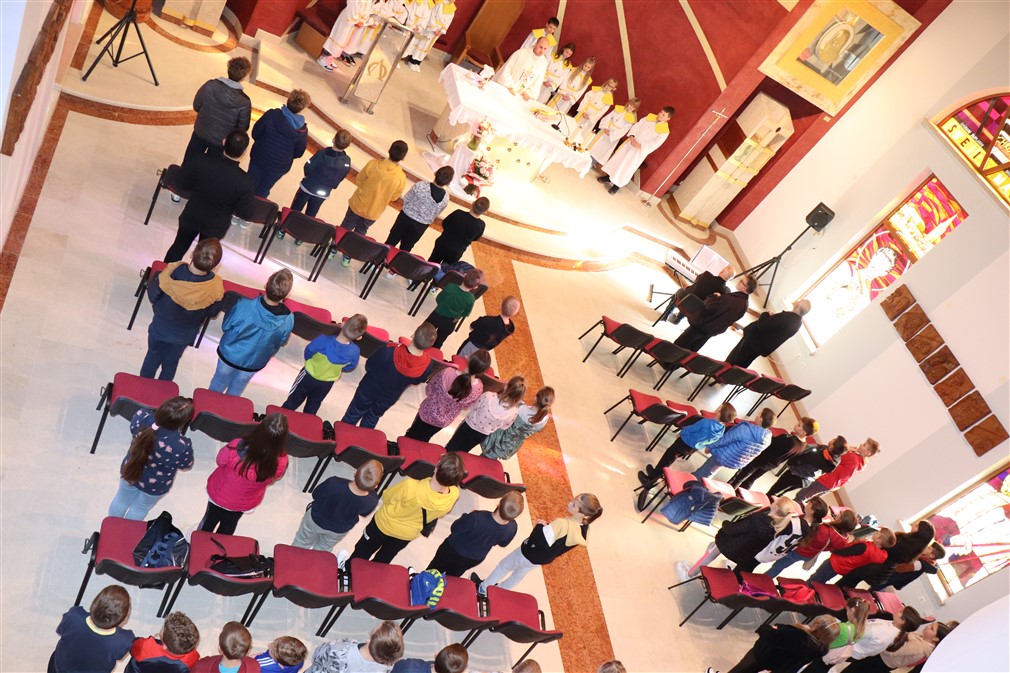 Potom im je pojasnio što znače tri križa koja stavljamo na početku evanđelja na čelo, usta i srce. „Znak križa na čelu znači da smo razumjeli ono što nam Isus govori, križ na ustima da to možemo drugima govoriti, a na srcu da to živimo“, rekao je, te im to još više približio primjerima, gdje oni u školi, igri mogu uistinu to posvjedočiti svojim dobrim djelima. U tom vidu, je ukazao na lik sv. Majke Terezije koja je malo govorila riječima, a njezin pravi govor je bio onaj djelima. „To Isus želi od svakoga od nas, Isus nas uvijek podučava u evanđelju, Isus želi da znamo govoriti, potiče nas da drugima govorimo o Njemu, o evanđelju, ali prvenstveno želi da mi to živimo. Stoga, neka se ne dogodi kad izađemo iz crkve da smo drugi, već kao i u crkvi i izvan nje budimo primjer“, potaknuo je propovjednik.