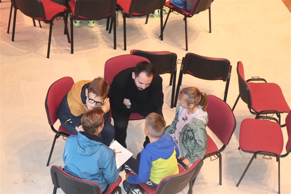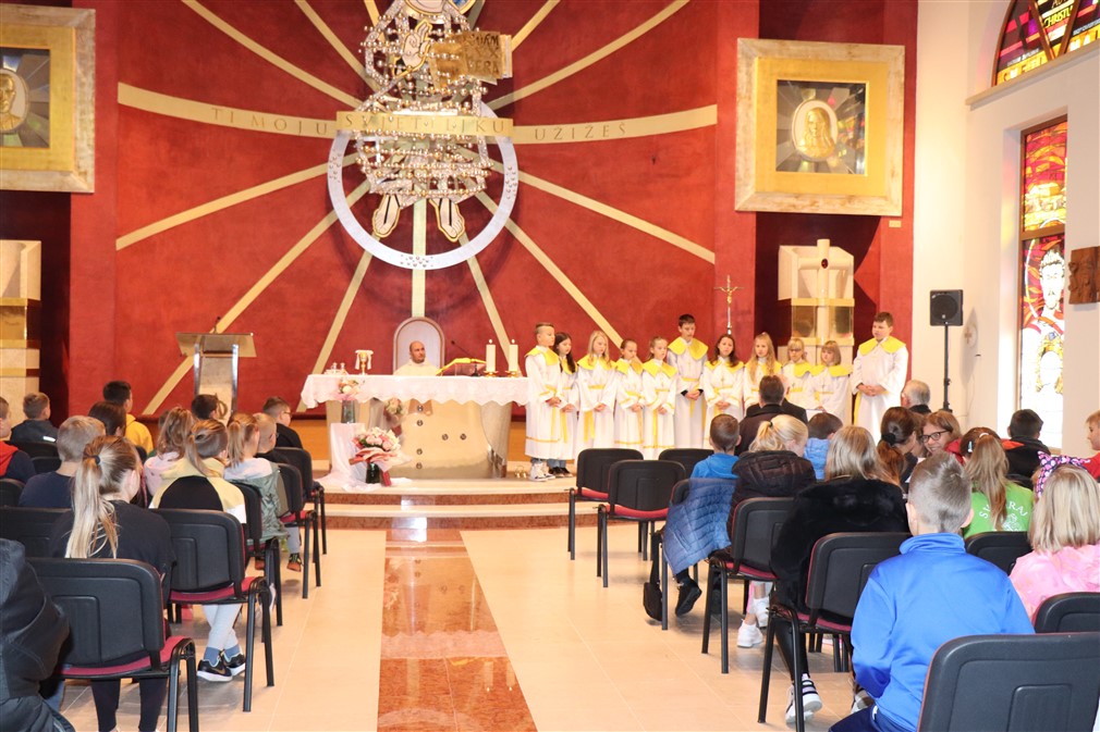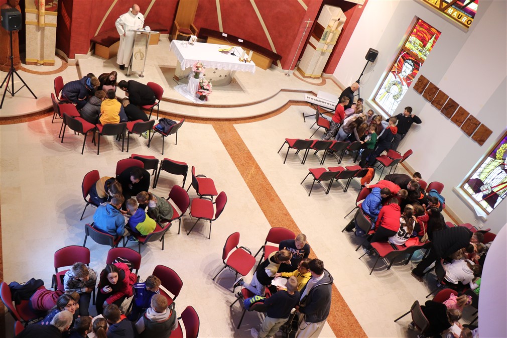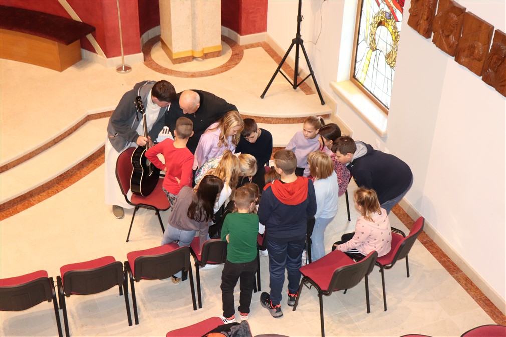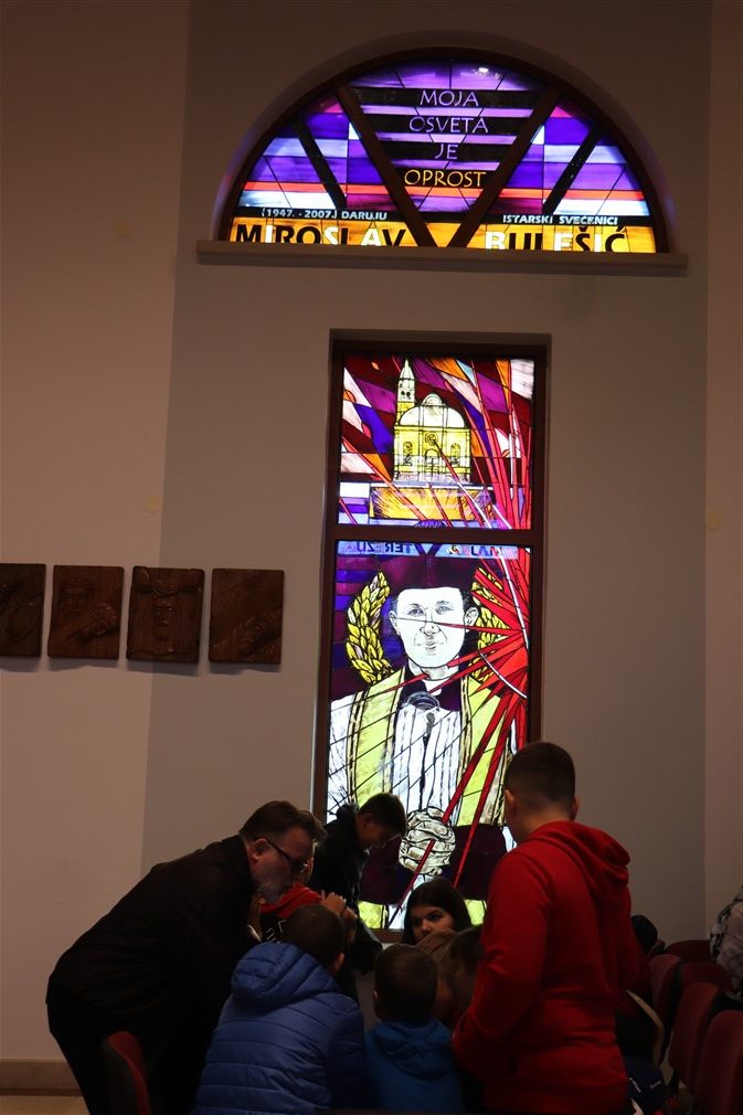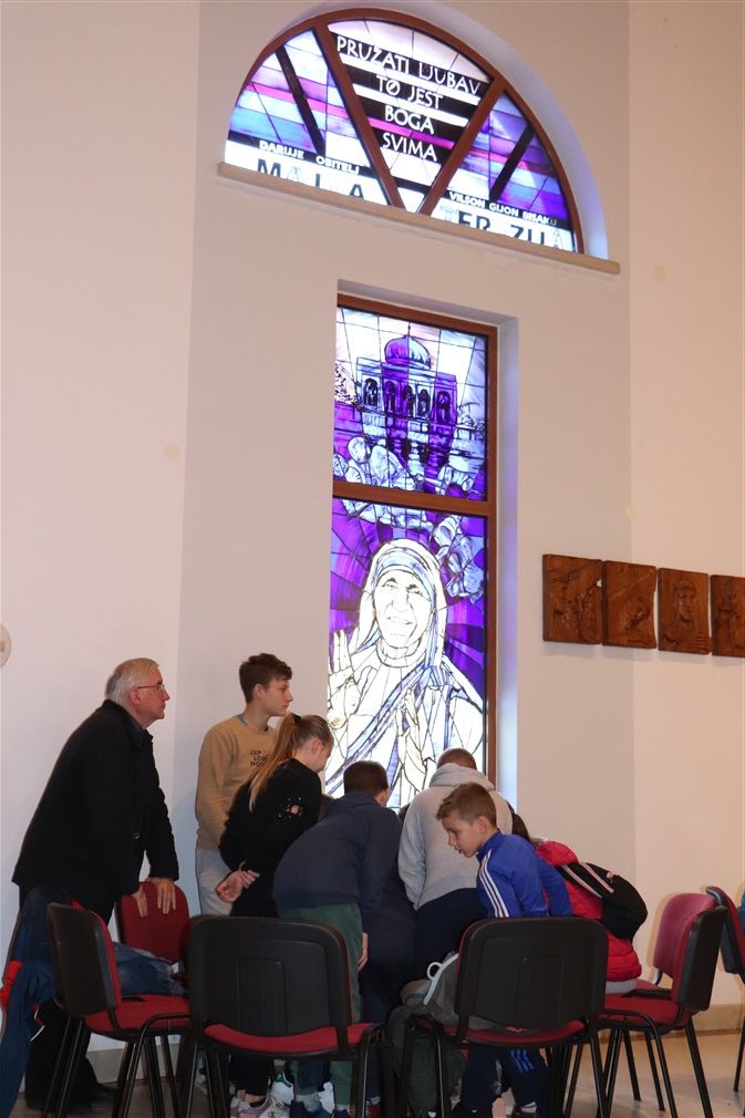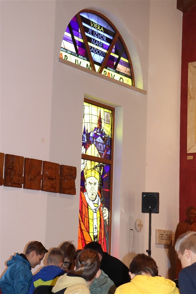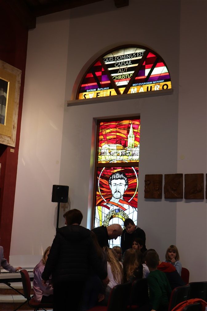 Kroz ragovor o svecima i blaženicima koji krase vitraje, sv. Mauru, sv. Ivanu Pavlu II., sv. Majci Tereziji te bl. Miroslavu Bulešiću p. Jure je potaknuo ministrante da istaknu njihove najpoznatije značajke; osim što su pozorno slušala, djeca su pokazala i izrazitu razinu znanja o tim Božjim ugodnicima.