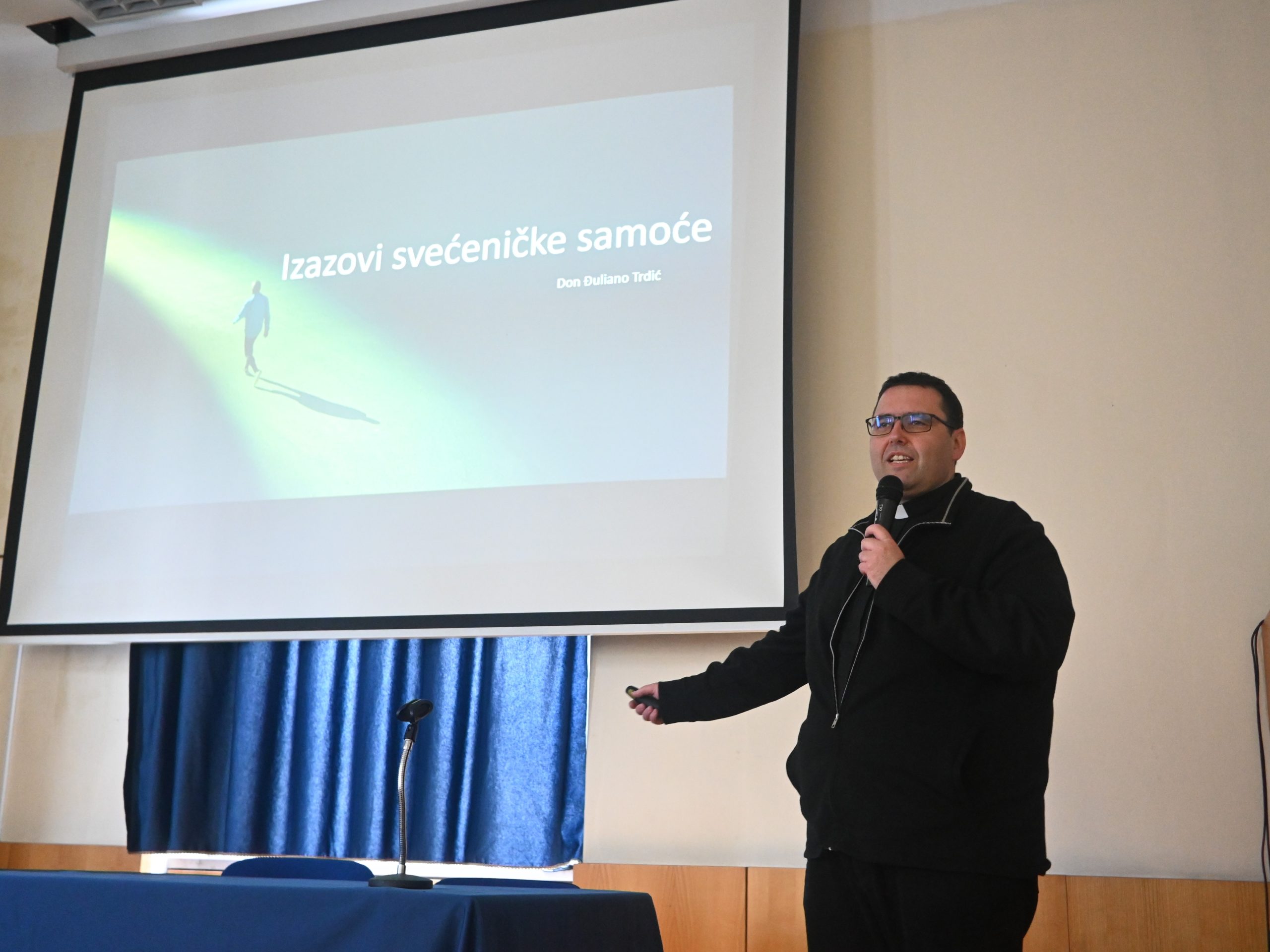 Nakon što je zahvalio na riječima dobrodošlice i pozivu na susret svećenika, redovnika i redovnika Porečke i Pulske biskupije, vlč. Trdić je protumačio temeljne pojmove o kojima će govoriti te definirao samoću kao stanje kada je osoba fizički odvojena od drugih ljudi ili se osjeća izoliranom, pa i onda kada je okružena drugim ljudima. Govorio je o dobrovoljnoj i nametnutoj samoći, tj. o samoći koju osoba, svećenici ili redovnici, biraju naspram samoći koju zbog nekih razloga mogu osjetiti nametnutom. Tako, onda samoća može s jedne strane izjedati čovjekovu nutrinu a može biti i veliki potencijal za svetost.