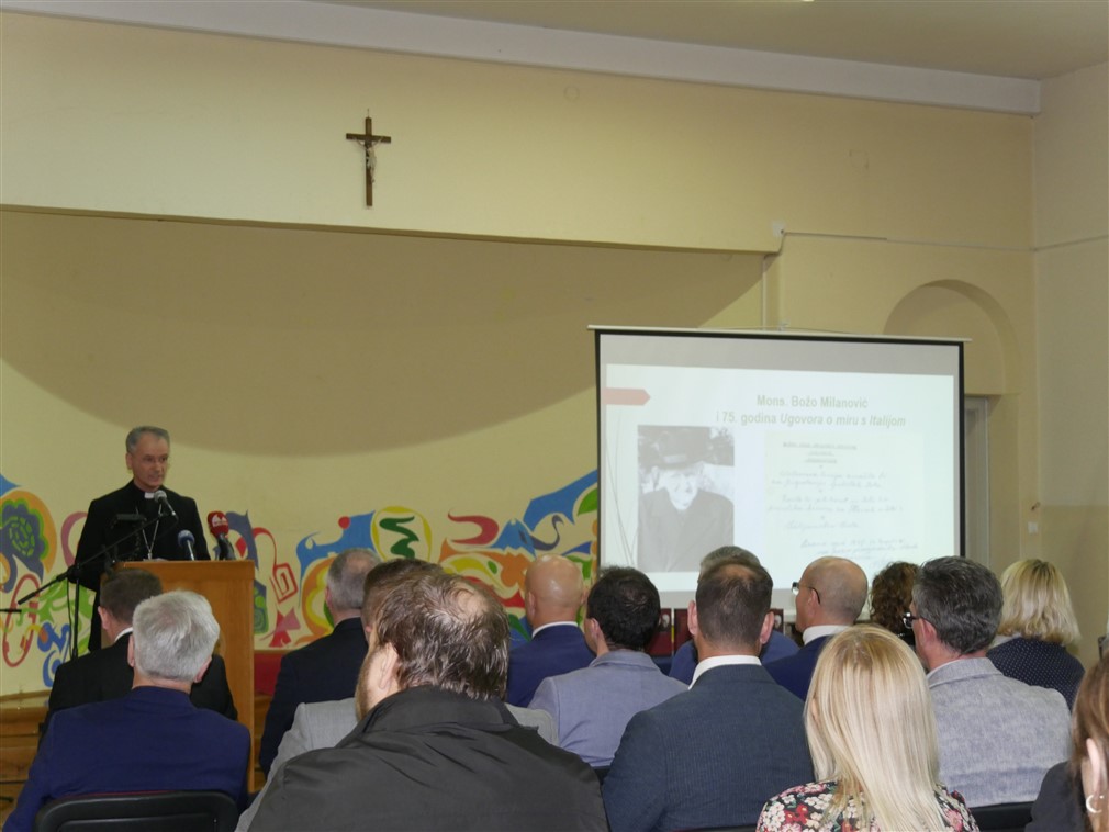 Prvi se okupljenima obratio nadbiskup mons. dr. Dražen Kutleša koji je nakon prigodnih pozdrava, govoreći o djelovanju mons. Milanovića istaknuo da se „među njegovim zaslugama snažno ističe i opravdano na prvo mjesto stavlja presudna uloga u pripojenju Istre matici Domovini nakon Drugoga svjetskog rata. Danas, kada i ovom Svečanom akademijom posvećenom mons. Milanoviću, na poseban način obilježavamo 75. obljetnicu potpisivanja Ugovora o miru s Italijom, može se ustvrditi da je to njegovo najveće postignuće.“