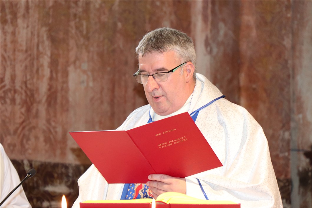 U prepunoj crkvi koju su ispunili, kako domaći, tako i pristigli vjernici iz rodne župe zavjetovanika Kotor Varoš, iz župe Kamensko, kao i iz Welsa, te mnogobrojna rodbina, svetu misu predvodio je viceprovincijal Hrvatske pavlinske provincije Marije Kraljice Anđela fra Ivan Šarić, u zajedništvu sa subraćom pavlinima, te drugim svećenicima, među kojima su bili sadašnji i bivši župnik iz Kotor Varoša fra Zoran Mandić i fra Petar Karajica. Među koncelebrantima je bio i mons. Antun Sente, rektor nacionalnog svetišta sv. Josipa u Karlovcu.