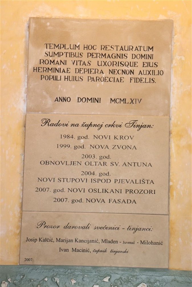 Župna crkva svetih Šimuna i Jude, apostola u Tinjanu jednobrodna je građevina sa svetištem i sakristijom. U crkvi je smješteno više oltara: glavni oltar sa svetohraništem i kipovima svetih Šimuna i Jude Tadeja, oltar sa slikom svetih Ivana i Pavla, oltar sa slikom “Smrt svetog Josipa”, oltar svetog Antuna s drvenim retablom iz XVII. stoljeća, oltar s gipsanim kipovima BDM, svete Ane i svete Agneze te kameni oltar prema puku s ambonom. Gipsani kip