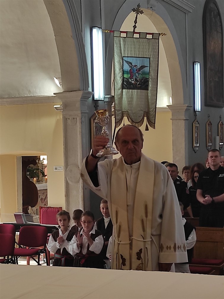 Potom je župnik istaknuo da je župa za tu prigodu dobila na dar novi kalež od jednog Žminjca koji živi i radi u Italiji. Donator je Flavio Božac.