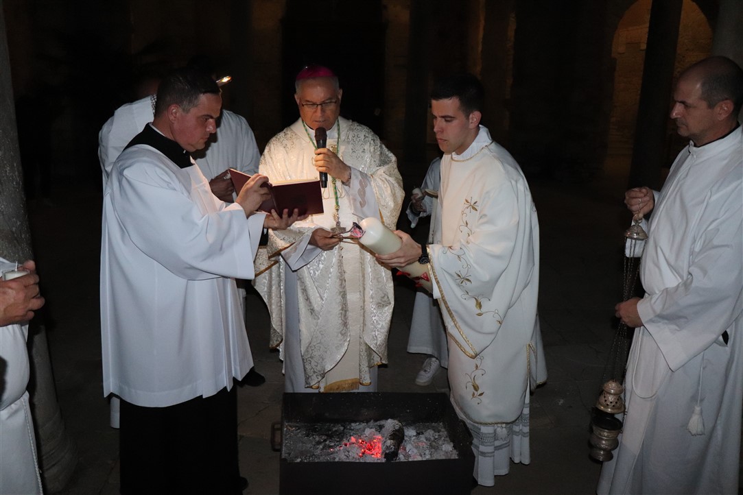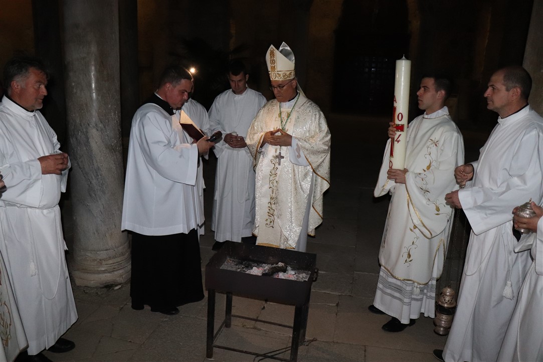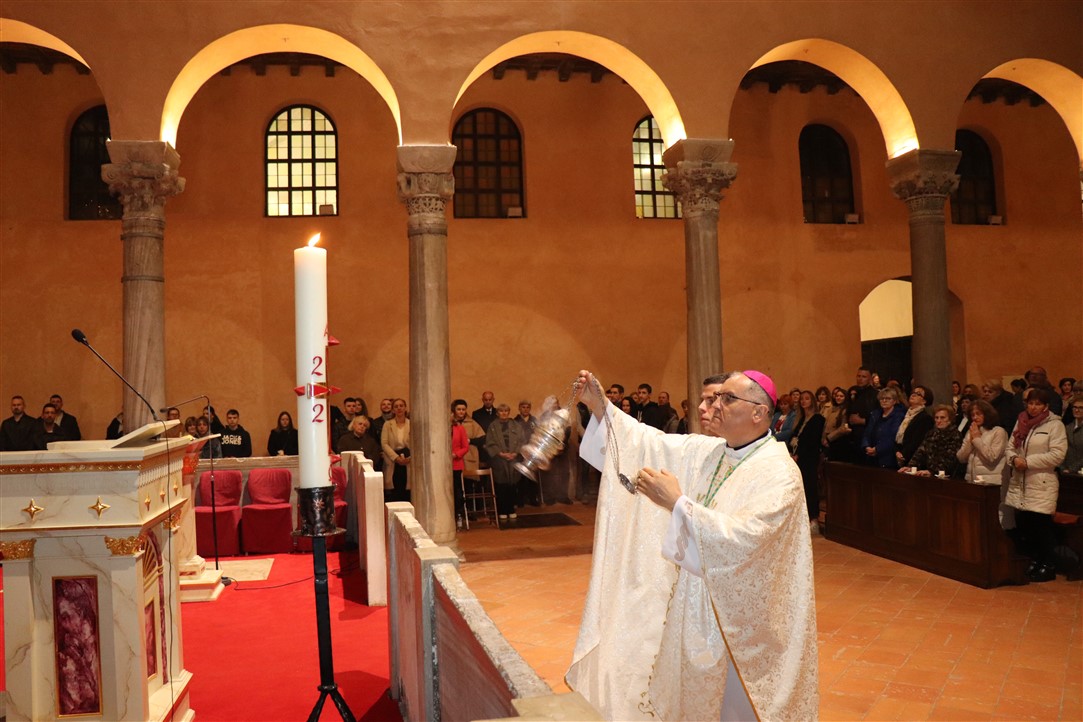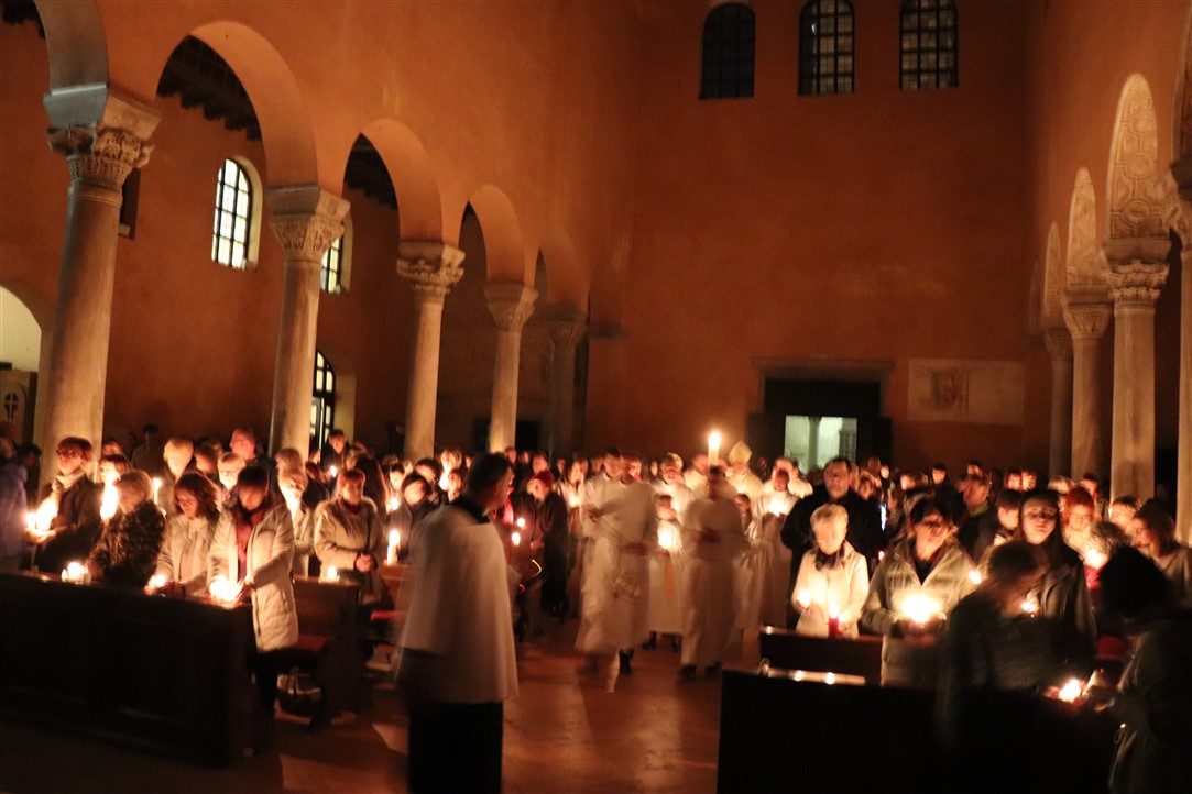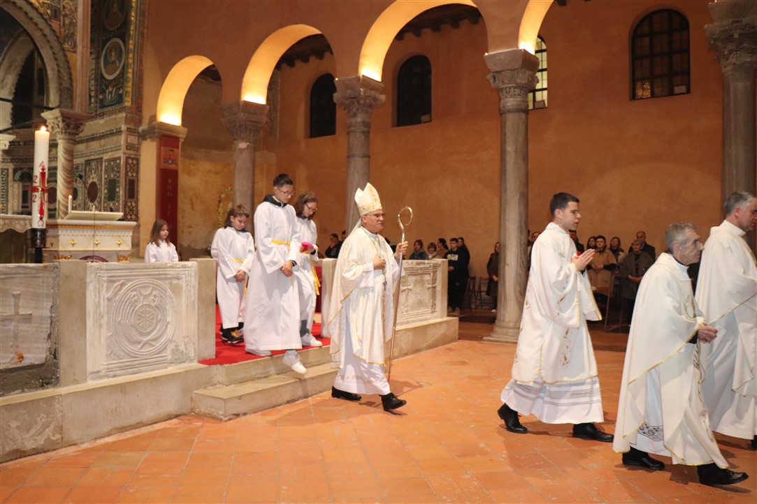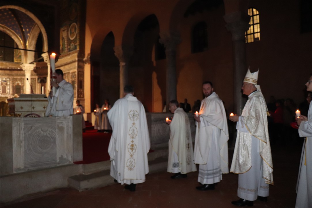 Služba svjetla započela je u atriju povijesnog kompleksa Eufrazijane. Nakon svečanog unošenja Svjetla Kristova, Vazmeni hvalospjev veličanstveno je otpjevao biskup Ivan.