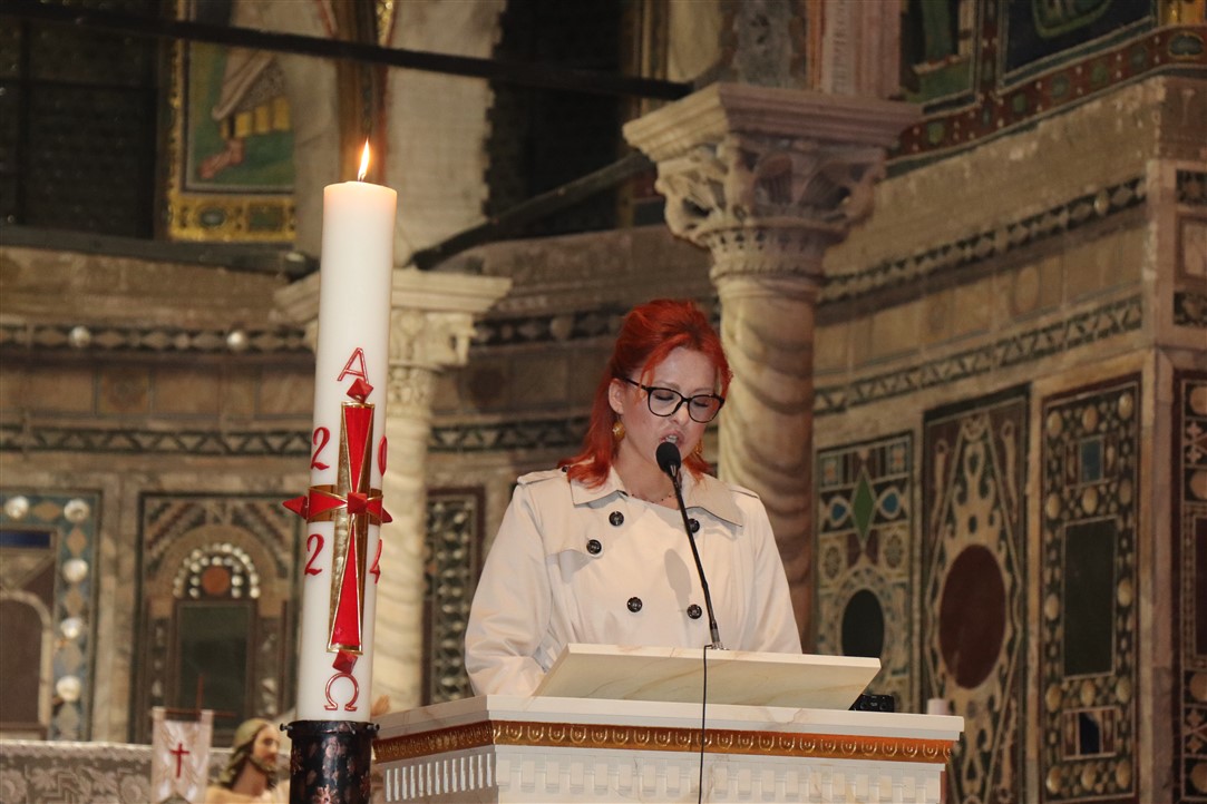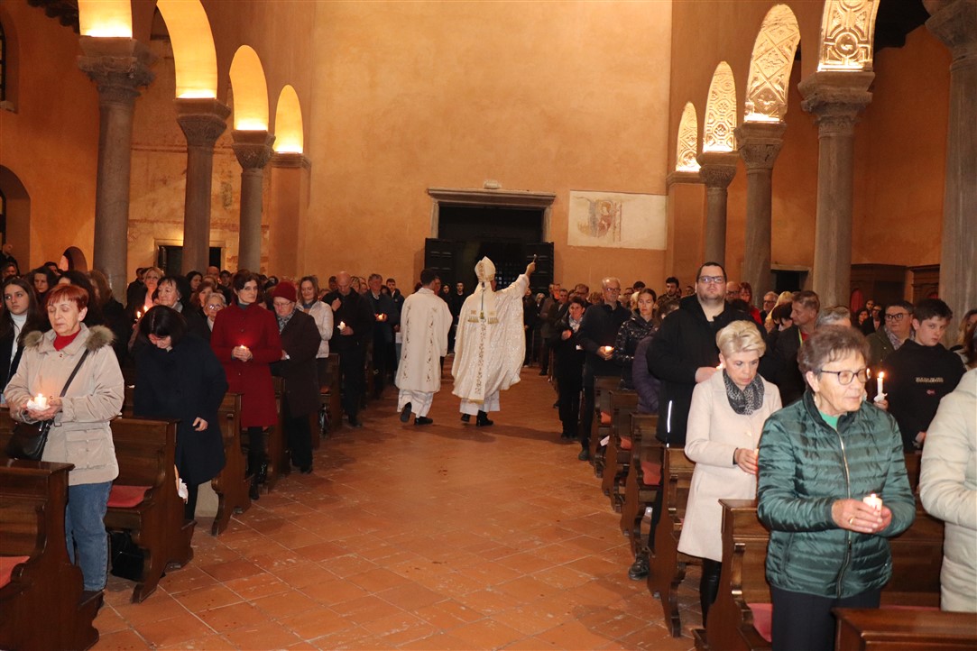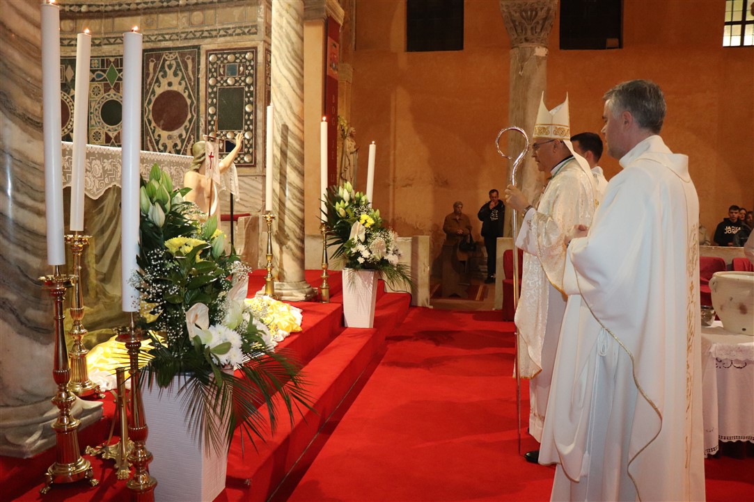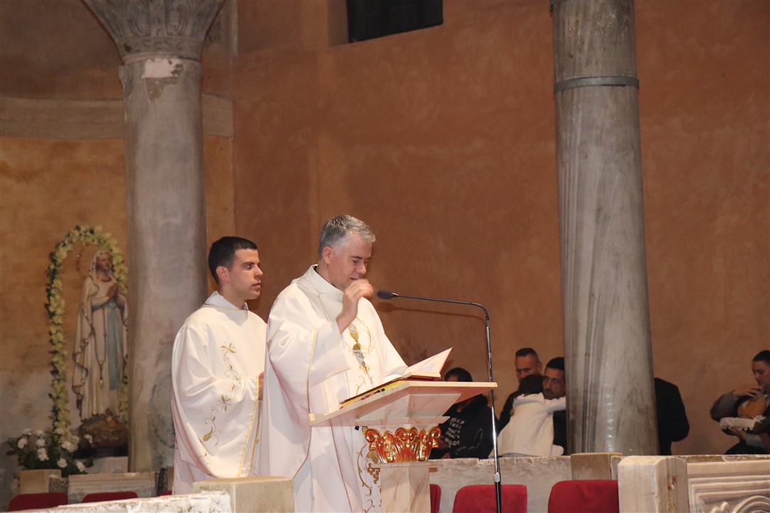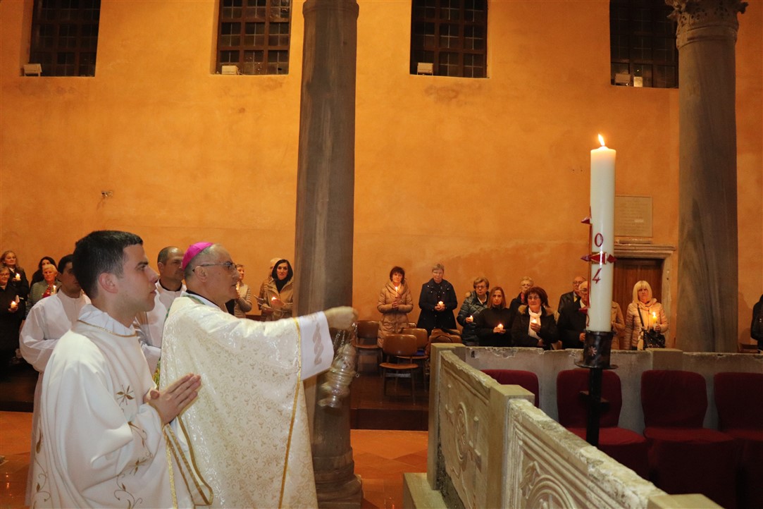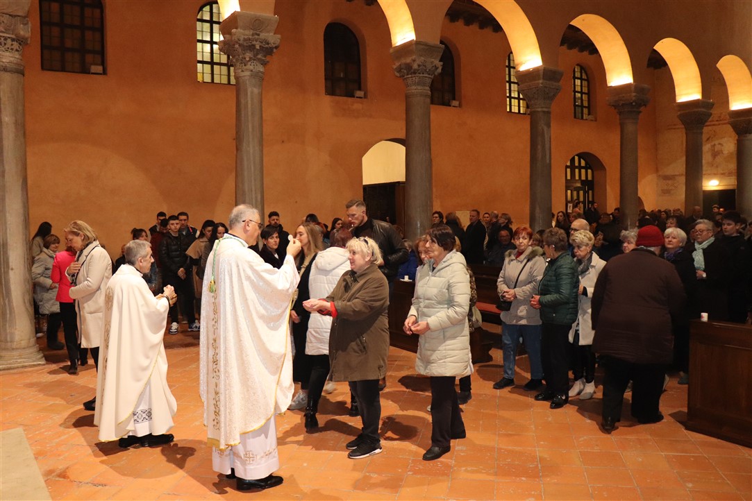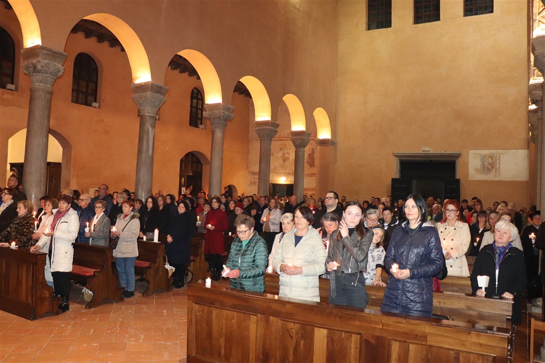 Služba svjetla započela je u atriju povijesnog kompleksa Eufrazijane. Nakon svečanog unošenja Svjetla Kristova, Vazmeni hvalospjev veličanstveno je otpjevao biskup Ivan.