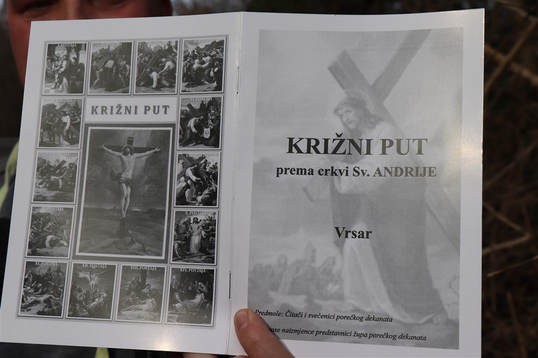 Na petu korizmenu nedjelju, 17. ožujka, održan je tradicionalni križni put „Ka Sv. Andriji“ u Vrsaru. Stotinjak vjernika iz te i okolnih župa okupilo se po četrnaesti put na tu redovitu godišnju pobožnost križnog puta u prirodi, u hodu prema crkvi sv. Andrije. Okupljanje je bilo kod vrsarskoga groblja gdje je nazočne dočekao domaćin, vlč. Lino Zohil, župnik Vrsara i Gradine. Nakon župnikova uvodnog pozdrava, okupljeni su, predvođeni križem, krenuli preko ceste, pored lokve Fabian, po šljunčanoj stazi koja vodi do crkvice sv. Andrije. Postaje Križnoga puta postavljene su na stabla uz stazu, a napravljene su od grana iz okolne šume te drvenih ploča s izrezbarenim rimskim brojevima postaja. Tekst križnoga puta čitali su župljani, a župnik je izrekao prigodne meditacije. Stigavši vijugavom stazom do vrha brda i crkvice sv. Andrije, hodočasnici su izmolili zadnju postaju koja se nalazi na stablu ispred crkve te ondje sa završnom molitvom i promišljanjem zaključili pobožnost križnoga puta.