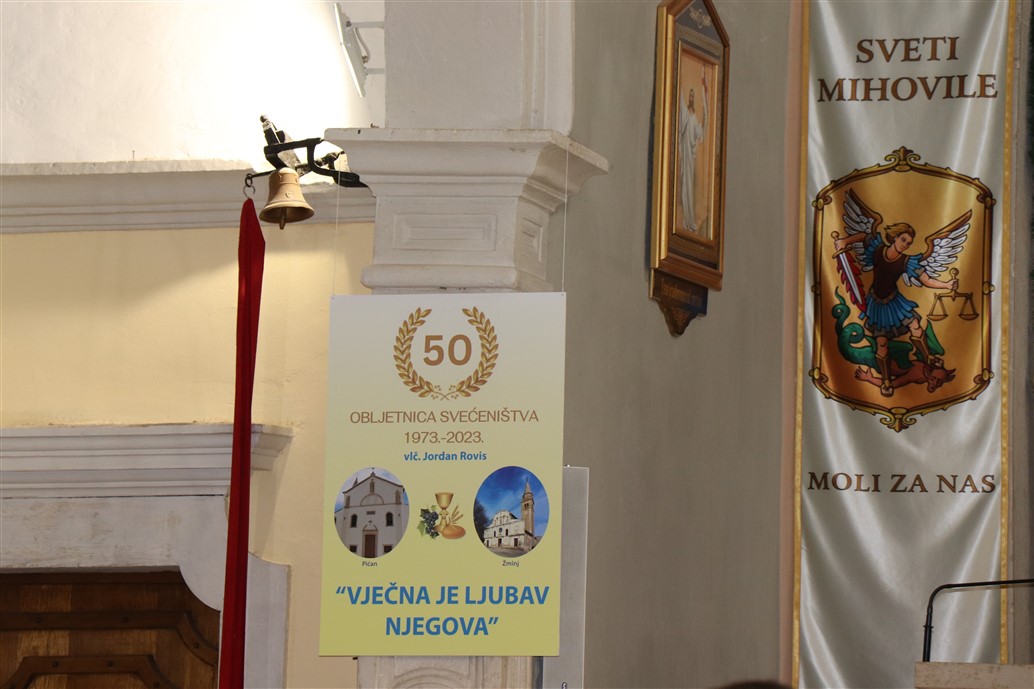 Vlč. Jordan Rovis, žminjski župnik, nakon prve proslave u svojoj rodnoj župi Pićan u listopadu, zahvalio je Bogu za 50 godina svećeničke službe, u nedjelju, 19 studenog, i u Župi sv. Mihovila u Žminju gdje djeluje već 16 godina. Zlatomisnik je predvodio misno slavlje, a prigodnu je homiliju uputio porečki i pulski biskup u miru mons. Ivan Milovan. Na početku je okupljene pozdravio moderator slavlja, aktivni župljanin žminjske župe, dr. sc. Elvis Orbanić. Uz slavljenika i Oca Biskupa koncelebrirali su: kancelar biskupije mons. Sergije Jelenić, pazinski dekan preč. Mladen Matika, rovinjsko-kanfanarski dekan mons. Vilim Grbac te više svećenika. Misi je nazočila s. Anamarija Rakocija, provincijalna poglavarica sestara milosrdnica Riječke provincije, čije susestre već više od pola stoljeća djeluju u žminjskoj župi. Slavlju je nazočio načelnik Općine Žminj Željko Plavčić, ravnateljica mjesne osnovne škole Miranda Damijanić Roce te druge čelne ličnosti obrazovnih i kulturnih ustanova.