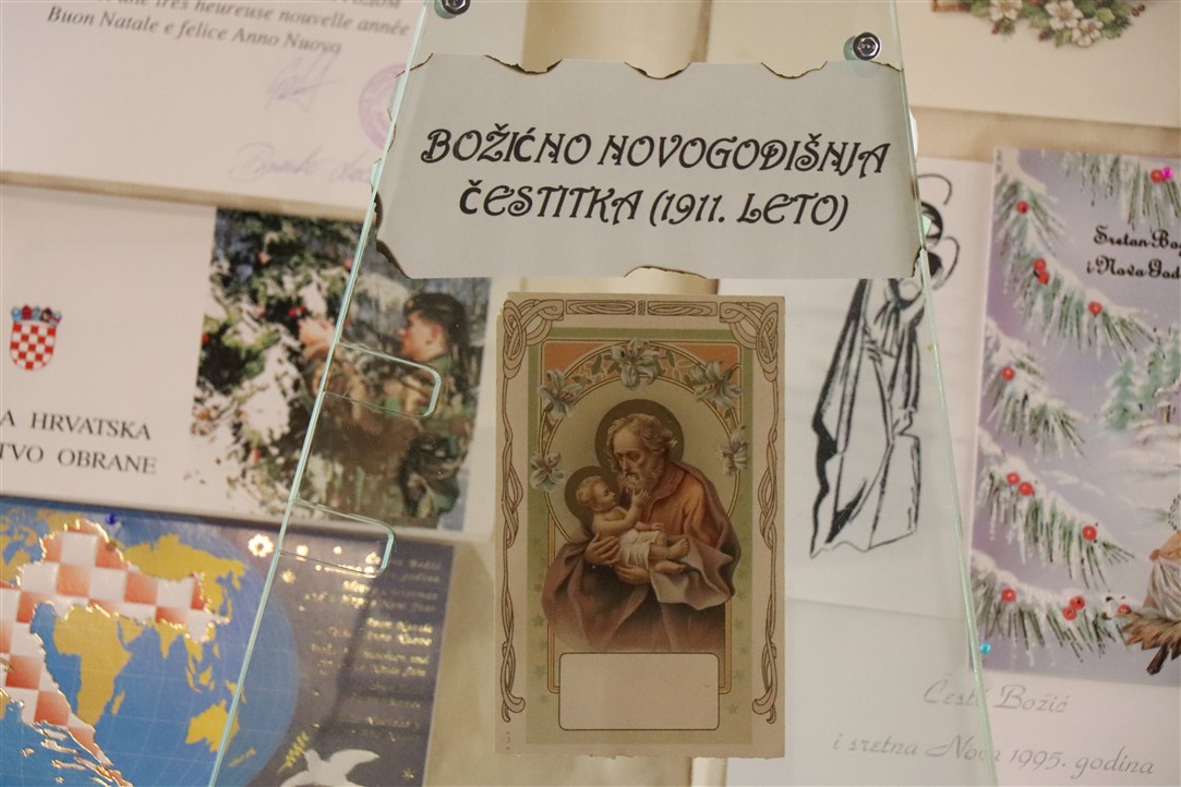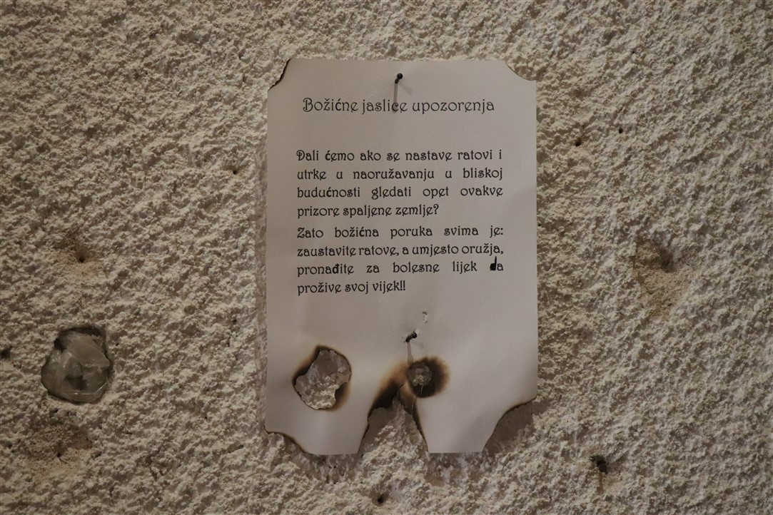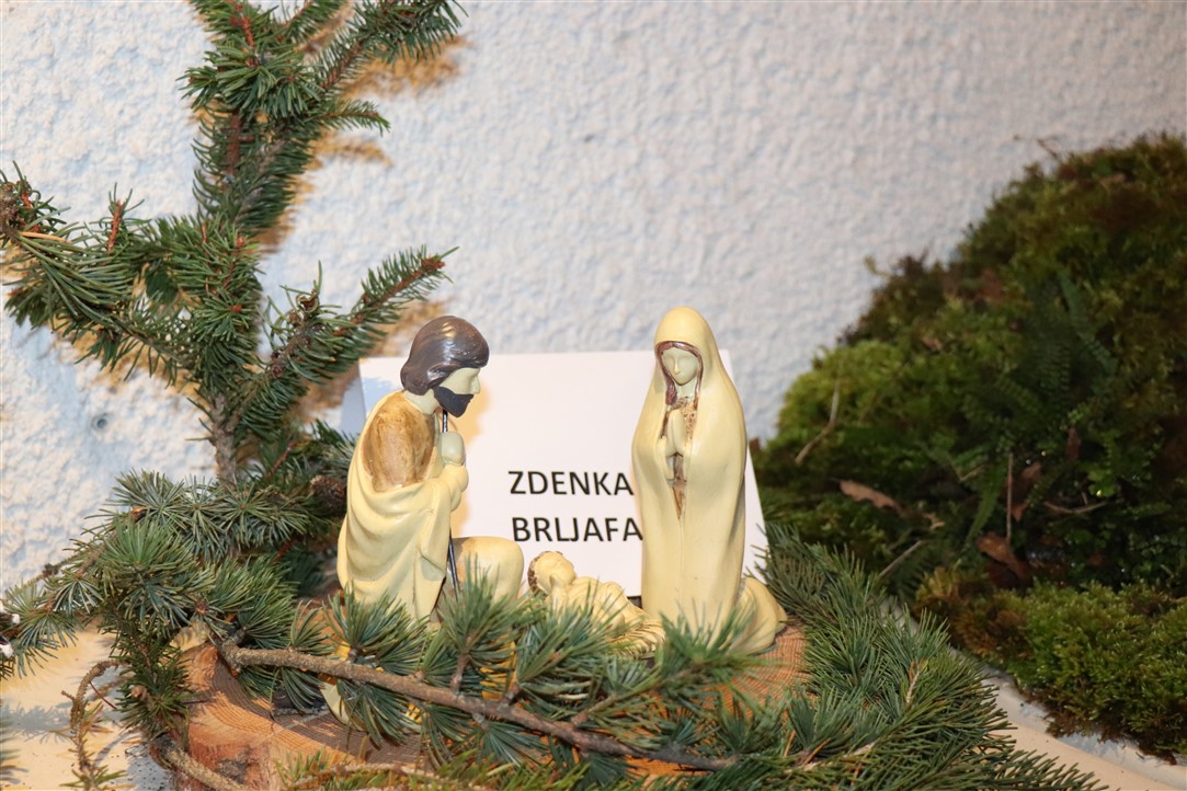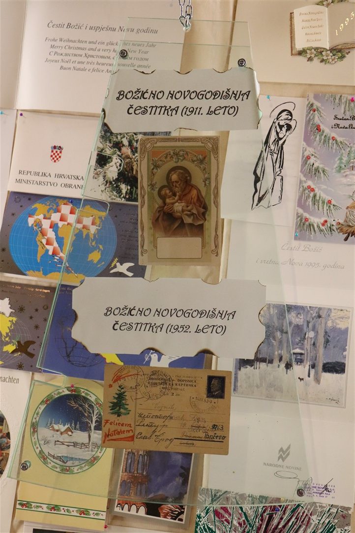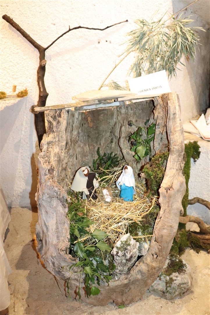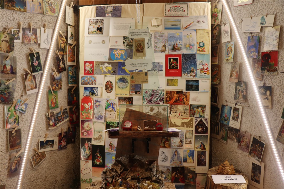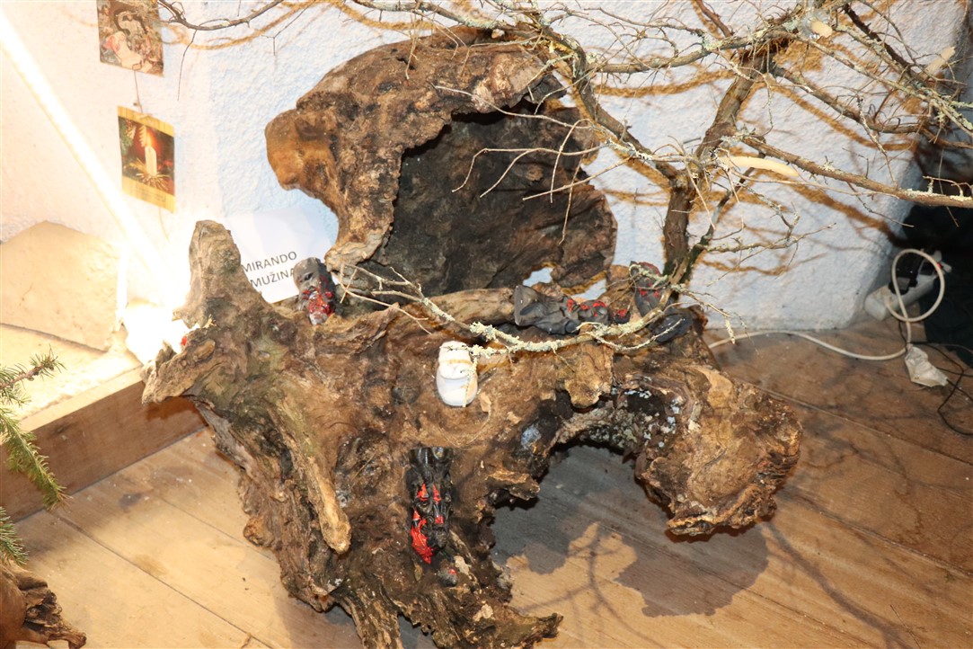 Jedne su jaslice izrazito neobične, podsjećaju na spaljenu zemlju na kojoj leže razbijene figure. Jedina svjetla točka su bijele jasle u kojima leži novorođeni Isus. Autor, Mirando Mužina je tim jaslicama želio svrnuti pozornost posjetitelja na zlo koje proizlazi iz neprestanog naoružavanja, te je želio poslati antiratnu poruku i simbolično istaknuti kako je u zlu koje postoji na svijetu Isus jedna svjetla točka nade. Mirando je ujedno i autor postava starih božićnih čestitki. Na tu je ideju došao promišljajući o suvremenom načinu slanja velikog broja čestitki „jednim klikom“, ali koje se jednako tako brzo i brišu. Želio je podsjetiti starije, a poučiti mlađe, kako je nekadašnji način, materijalnih, papirnatih čestitki, koje su često putovale poštom jako dugo, imao svoju vrijednost, napose u trajnosti uspomene. Najstarija je čestitka na izložbi iz 1911. godine, a Mužina je istaknuo kao njemu najdražu onu iz 1952. kojom je vojnik vojniku na odsluženju vojnog roka čestitao Božić, s jednog na drugi kraj nekadašnje države, na dopisnici pišući latinskim jezikom.