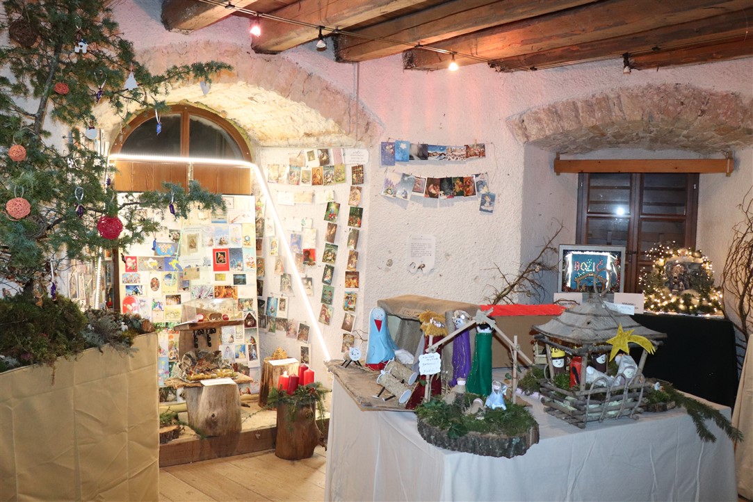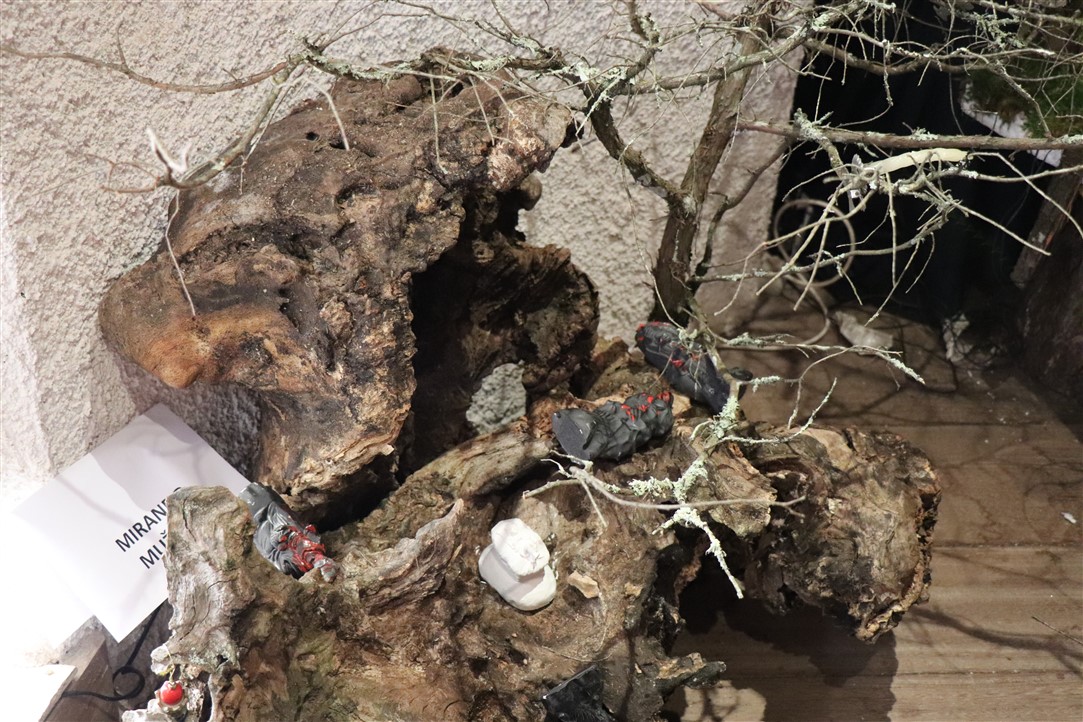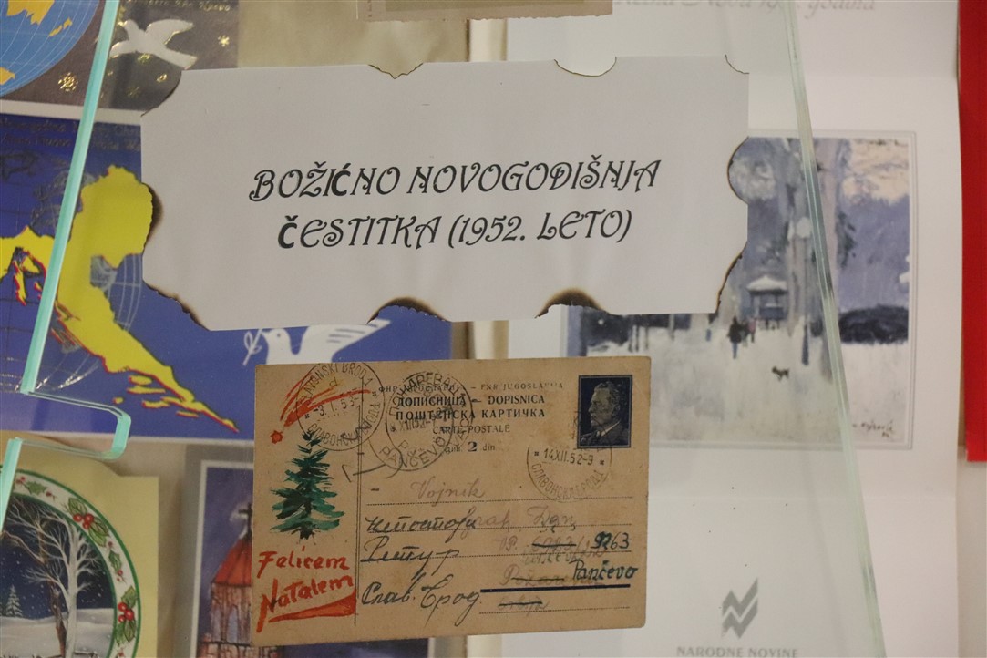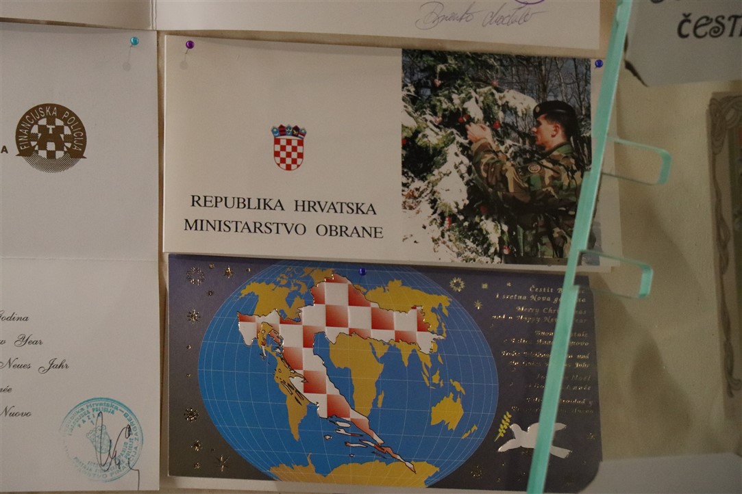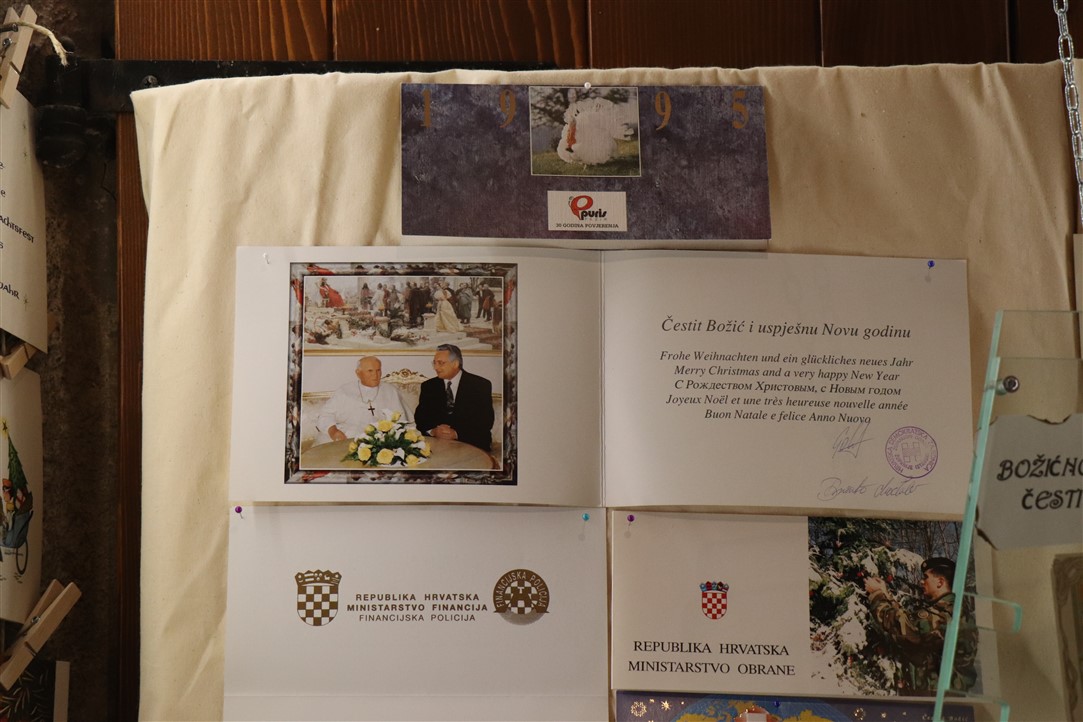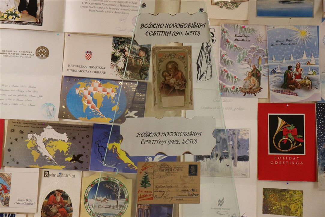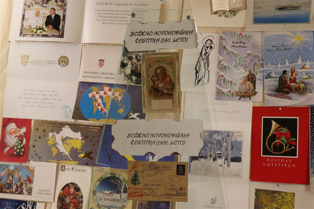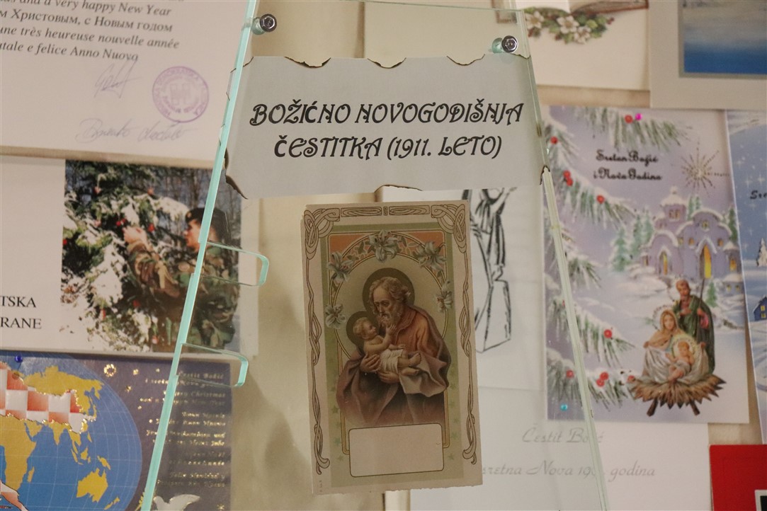 Jedne su jaslice izrazito neobične, podsjećaju na spaljenu zemlju na kojoj leže razbijene figure. Jedina svjetla točka su bijele jasle u kojima leži novorođeni Isus. Autor, Mirando Mužina je tim jaslicama želio svrnuti pozornost posjetitelja na zlo koje proizlazi iz neprestanog naoružavanja, te je želio poslati antiratnu poruku i simbolično istaknuti kako je u zlu koje postoji na svijetu Isus jedna svjetla točka nade. Mirando je ujedno i autor postava starih božićnih čestitki. Na tu je ideju došao promišljajući o suvremenom načinu slanja velikog broja čestitki „jednim klikom“, ali koje se jednako tako brzo i brišu. Želio je podsjetiti starije, a poučiti mlađe, kako je nekadašnji način, materijalnih, papirnatih čestitki, koje su često putovale poštom jako dugo, imao svoju vrijednost, napose u trajnosti uspomene. Najstarija je čestitka na izložbi iz 1911. godine, a Mužina je istaknuo kao njemu najdražu onu iz 1952. kojom je vojnik vojniku na odsluženju vojnog roka čestitao Božić, s jednog na drugi kraj nekadašnje države, na dopisnici pišući latinskim jezikom.
